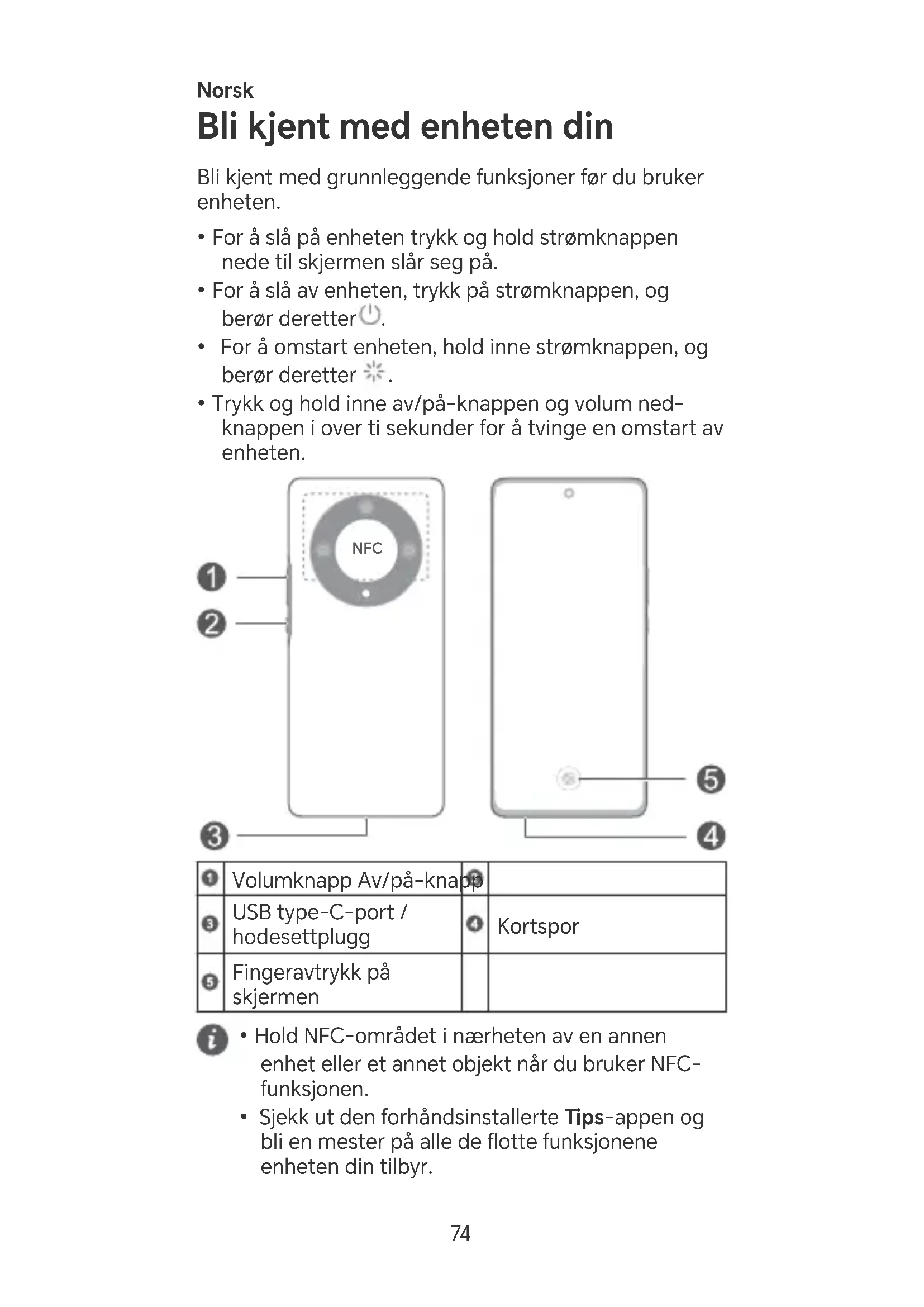 - Sjekk ut den forhåndsinstallee Tips-appen og bli en mester på alle de otte funksjonene enheten din tilbyr. 74Komme i gang