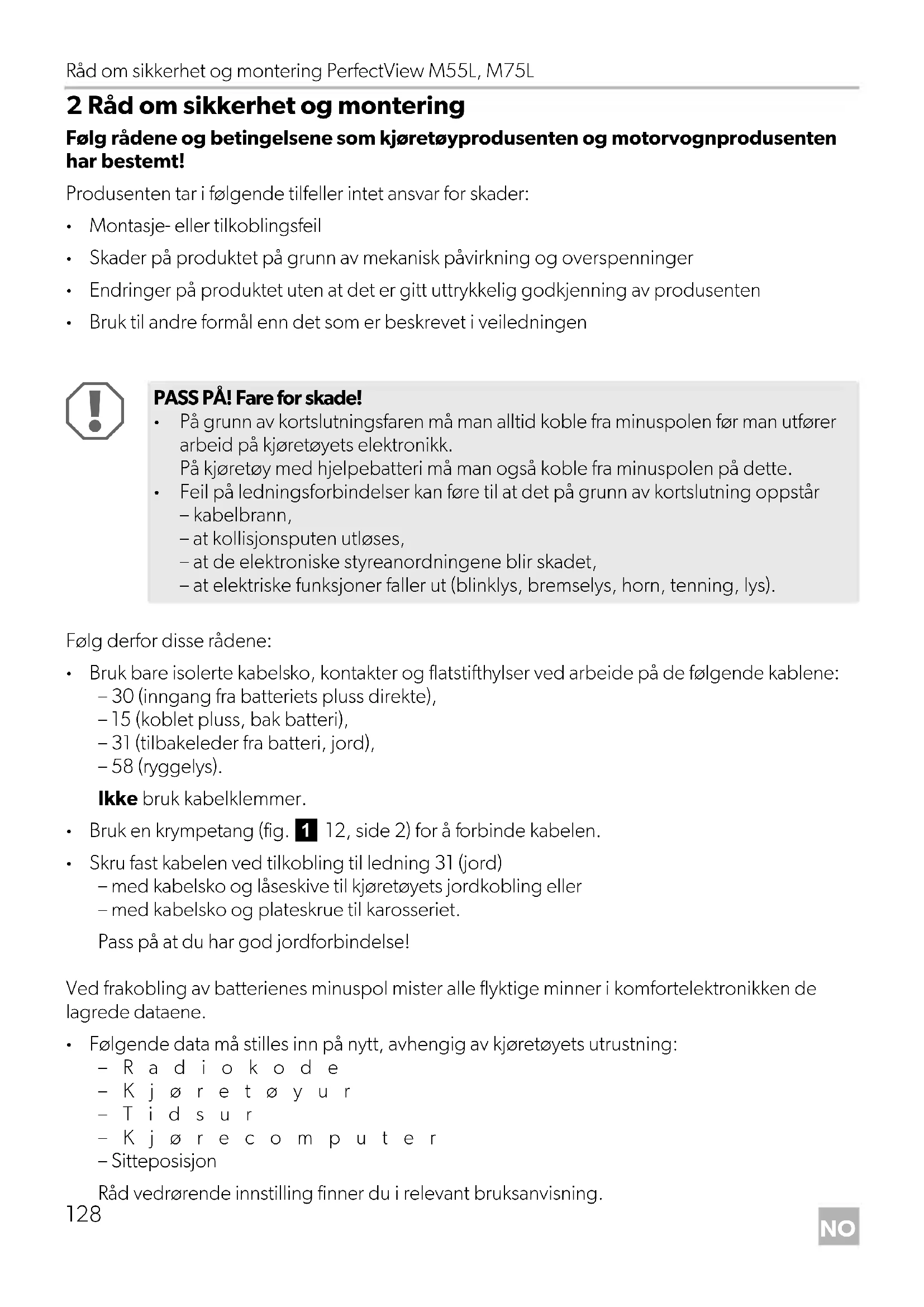 2 Råd om sikkerhet og montering Følg rådene og betingelsene som kjøretøyprodusenten og motorvognprodusenten har bestemt! Produsenten tar i følgende tilfeller intet ansvar for skader: