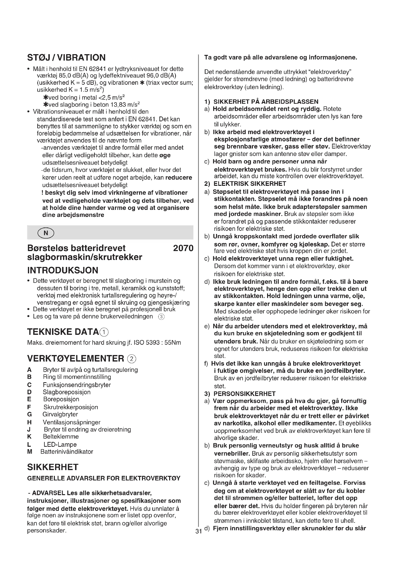 A Bryter til av/på og turtallsregulering B Ring til momentinnstilling C Funksjonsendringsbryter D Slagboreposisjon E Boreposisjon F Skrutrekkerposisjon G Girvalgbryter H Ventilasjonsåpninger J Bryter til endring av dreieretning K Belteklemme L LED-Lampe M Batterinivåindikator SIKKERHET
