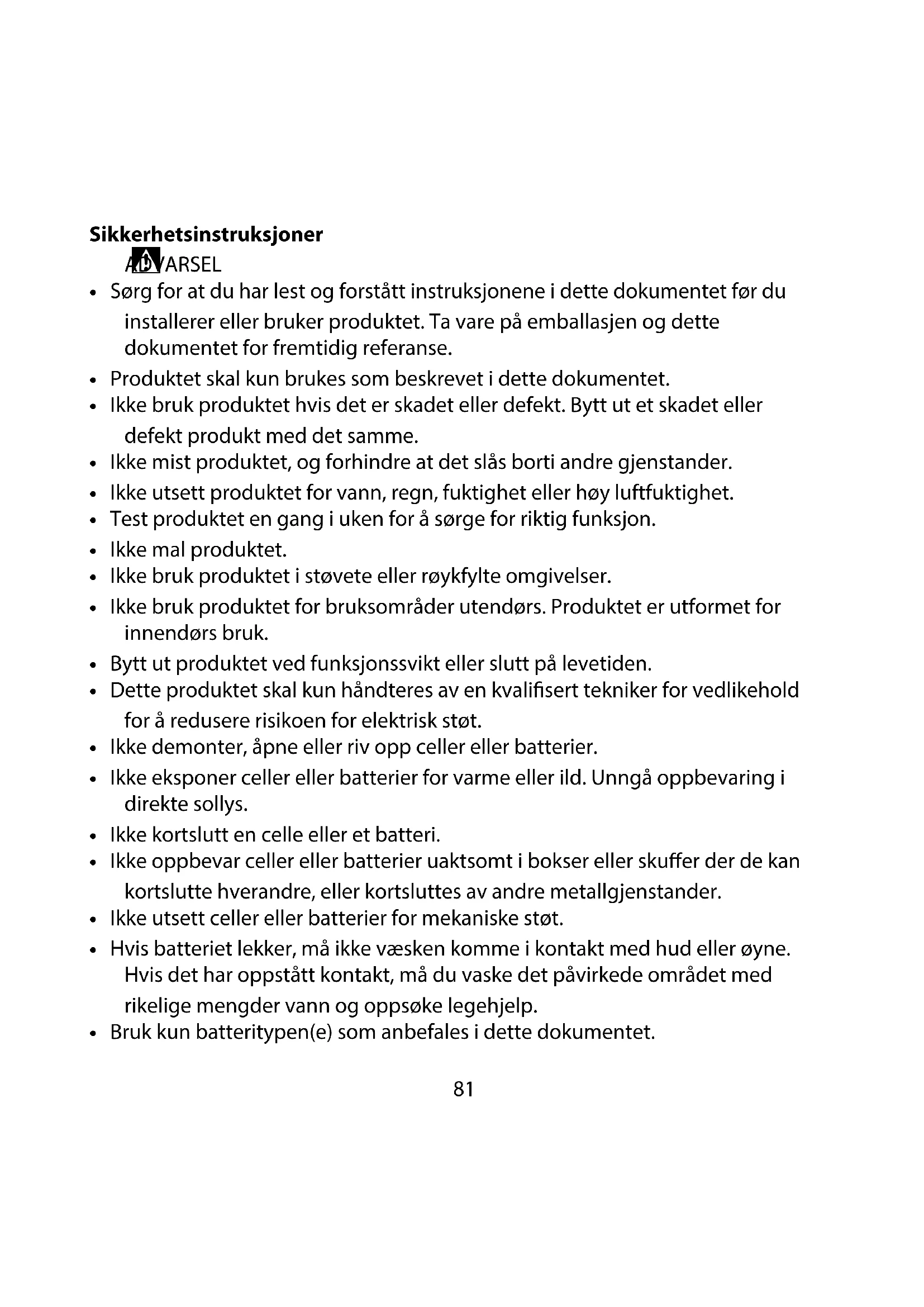 - Bruk kun batteritypen(e) som anbefales i dette dokumentet.82