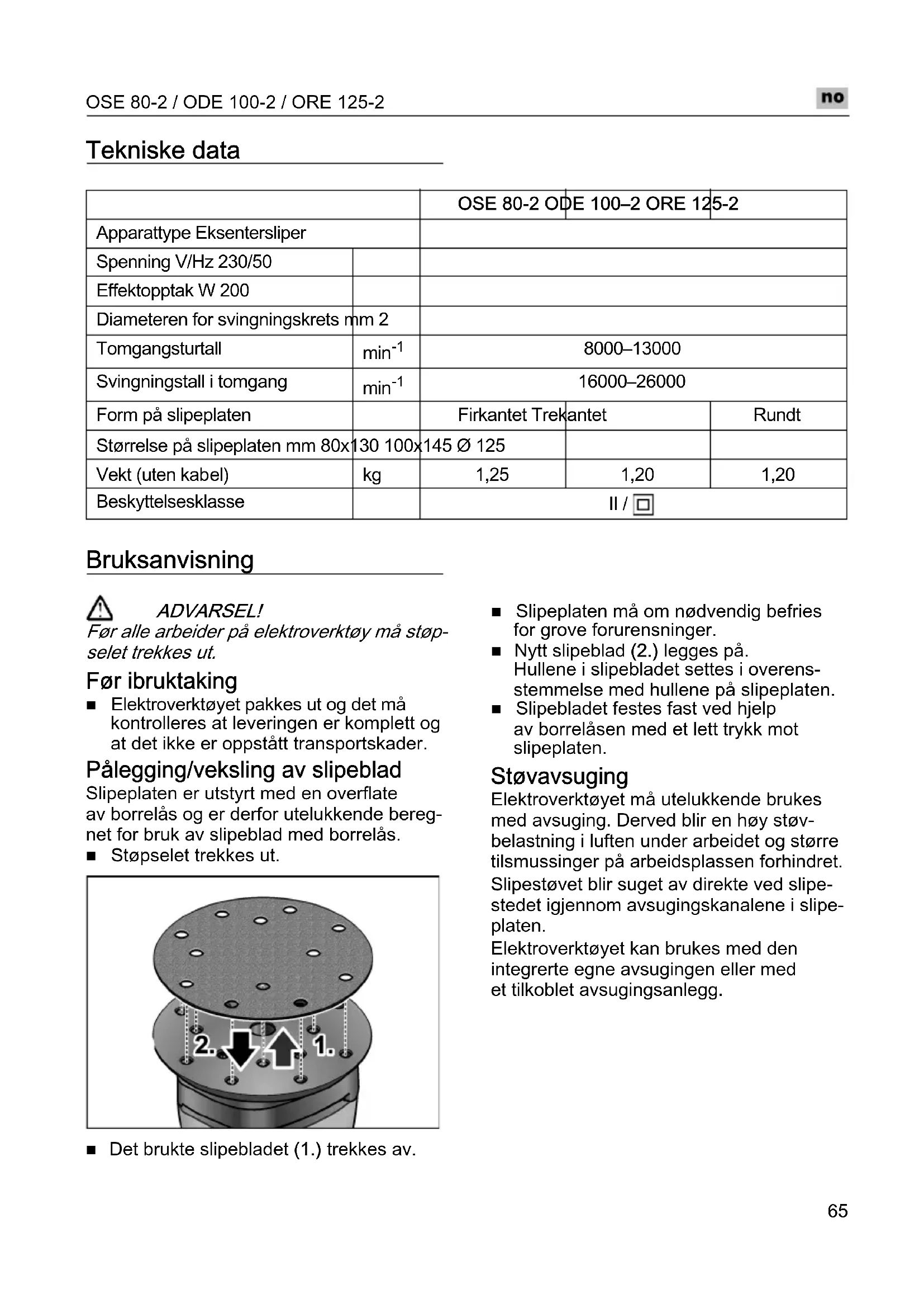 Tekniske data Bruksanvisning ADVARSEL! Før alle arbeider på elektroverktøy må støp- selet trekkes ut. Før ibruktaking Elektroverktøyet pakkes ut og det må kontrolleres at leveringen er komplett og at det ikke er oppstått transportskader. Pålegging/veksling av slipeblad Slipeplaten er utstyrt med en overflate av borrelås og er derfor utelukkende bereg- net for bruk av slipeblad med borrelås. Støpselet trekkes ut. Det brukte slipebladet (1.) trekkes av. Slipeplaten må om nødvendig befries for grove forurensninger. Nytt slipeblad (2.) legges på. Hullene i slipebladet settes i overens- stemmelse med hullene på slipeplaten. Slipebladet festes fast ved hjelp av borrelåsen med et lett trykk mot slipeplaten. Støvavsuging Elektroverktøyet må utelukkende brukes med avsuging. Derved blir en høy støv- belastning i luften under arbeidet og større tilsmussinger på arbeidsplassen forhindret. Slipestøvet blir suget av direkte ved slipe- stedet igjennom avsugingskanalene i slipe- platen. Elektroverktøyet kan brukes med den integrerte egne avsugingen eller med et tilkoblet avsugingsanlegg.
