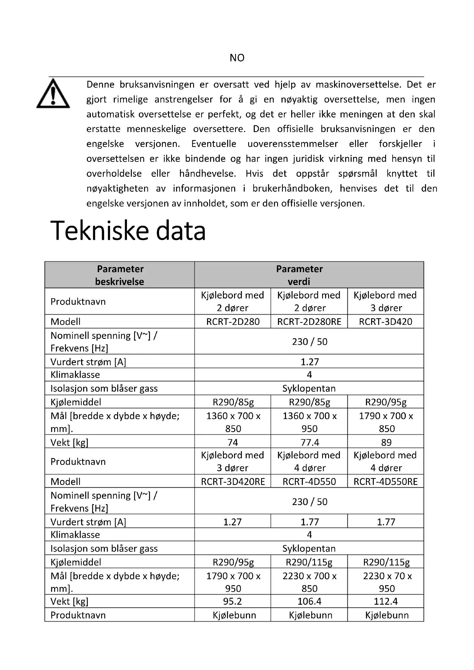 Denne bruksanvisningen er oversatt ved hjelp av maskinoversettelse. Det er gjort rimelige anstrengelser for å gi en nøyaktig oversettelse, men ingen automatisk oversettelse er perfekt, og det er heller ikke meningen at den skal erstatte menneskelige oversettere. Den offisielle bruksanvisningen er den engelske versjonen. Eventuelle uoverensstemmelser eller forskjeller i oversettelsen er ikke bindende og har ingen juridisk virkning med hensyn til overholdelse eller håndhevelse. Hvis det oppstår spørsmål knyttet til nøyaktigheten av informasjonen i brukerhåndboken, henvises det til den engelske versjonen av innholdet, som er den offisielle versjonen. Tekniske data Parameter beskrivelse Parameter verdi Produktnavn Kjølebord med 2 dører Kjølebord med 2 dører Kjølebord med 3 dører Modell RCRT-2D280