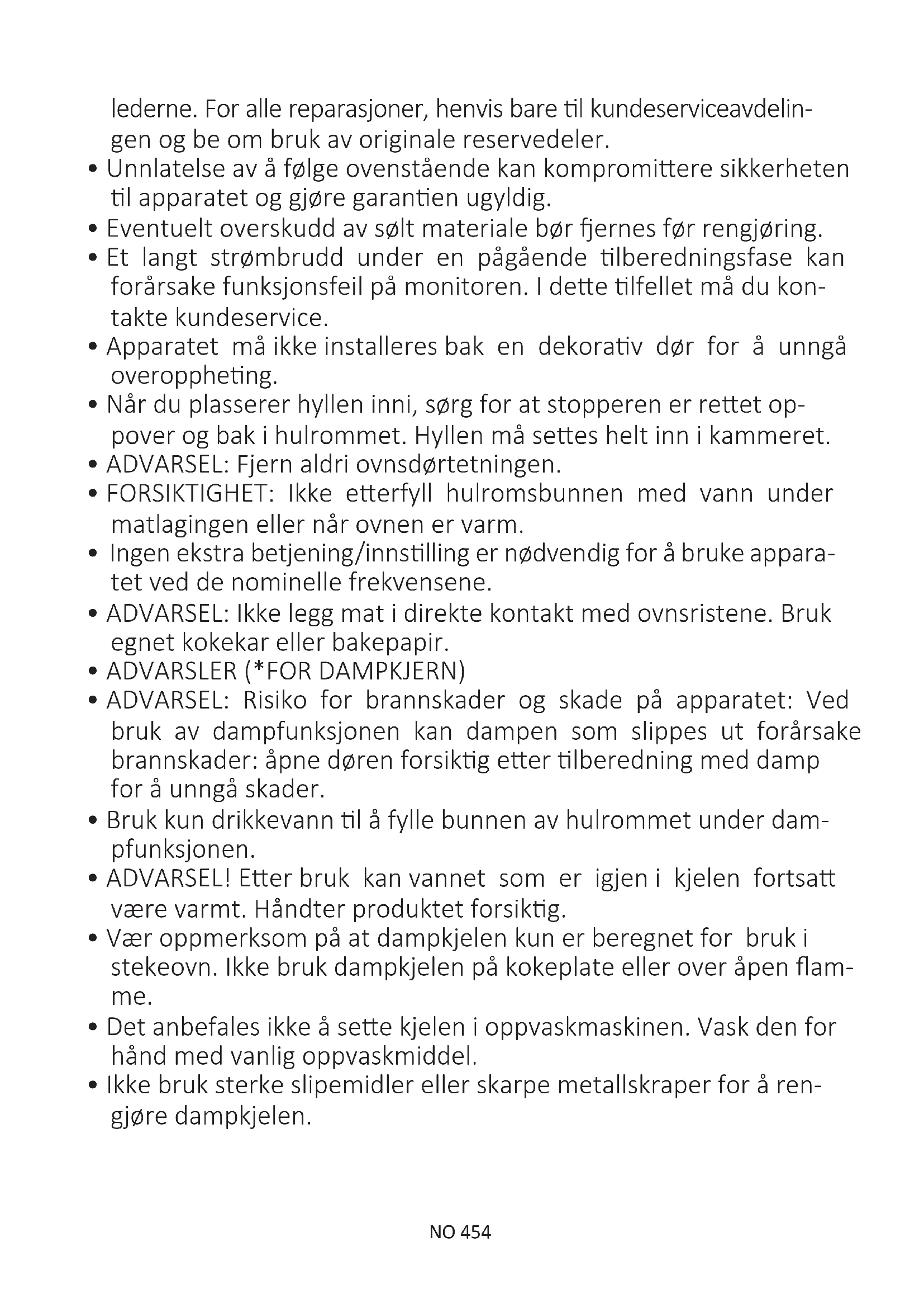 - ADVARSEL: Risiko for brannskader og skade på apparatet: Ved bruk av dampfunksjonen kan dampen som slippes ut forårsake brannskader: åpne døren forsikg eer lberedning med damp for å unngå skader.
