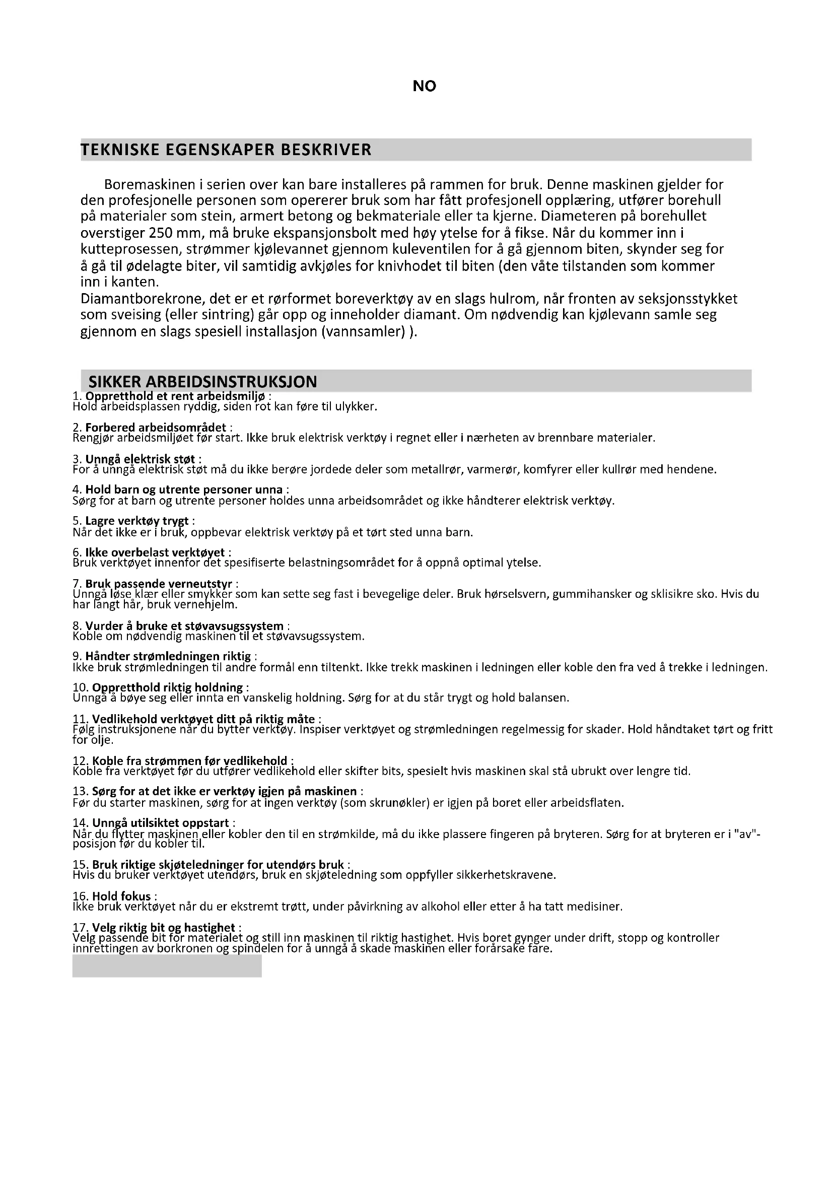 - Kvalifisert drift: Denne riggen skal kun betjenes av opplærte fagfolk. Den er egnet for boring av hull i materialer som stein, armert betong og asfalt, eller for kjerneboring. Følg alltid bruksanvisningen nøye.