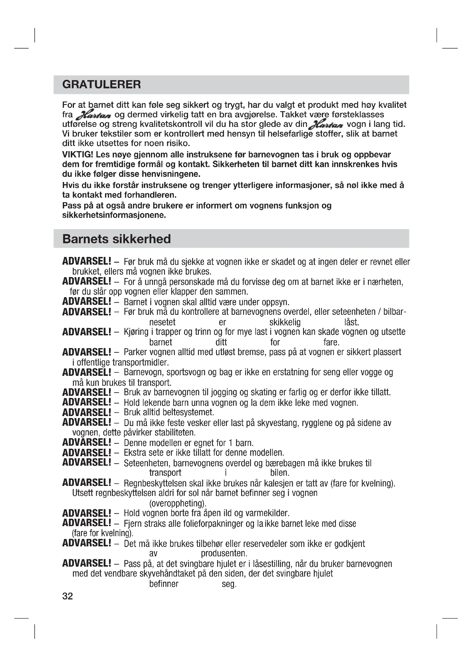 31ADVARSEL! – Før bruk må du sjekke at vognen ikke er skadet og at ingen deler er revnet eller brukket, ellers må vognen ikke brukes. ADVARSEL! – For å unngå personskade må du forvisse deg om at barnet ikke er i nærheten, før du slår opp vognen eller klapper den sammen. ADVARSEL! – Barnet i vognen skal alltid være under oppsyn. ADVARSEL! – Før bruk må du kontrollere at barnevognens overdel, eller seteenheten / bilbar- nesetet er skikkelig låst. ADVARSEL! – Kjøring i trapper og trinn og for mye last i vognen kan skade vognen og utsette barnet ditt for fare. ADVARSEL! – Parker vognen alltid med utløst bremse, pass på at vognen er sikkert plassert i offentlige transportmidler. ADVARSEL! – Barnevogn, sportsvogn og bag er ikke en erstatning for seng eller vogge og må kun brukes til transport. ADVARSEL! – Bruk av barnevognen til jogging og skating er farlig og er derfor ikke tillatt. ADVARSEL! – Hold lekende barn unna vognen og la dem ikke leke med vognen. ADVARSEL! – Bruk alltid beltesystemet. ADVARSEL! – Du må ikke feste vesker eller last på skyvestang, rygglene og på sidene av vognen, dette påvirker stabiliteten. ADVARSEL! – Denne modellen er egnet for 1 barn. ADVARSEL! – Ekstra sete er ikke tillatt for denne modellen. ADVARSEL! – Seteenheten, barnevognens overdel og bærebagen må ikke brukes til transport i bilen. ADVARSEL! – Regnbeskyttelsen skal ikke brukes når kalesjen er tatt av (fare for kvelning). Utsett regnbeskyttelsen aldri for sol når barnet befinner seg i vognen (overoppheting). ADVARSEL! – Hold vognen borte fra åpen ild og varmekilder. ADVARSEL! – Fjern straks alle folieforpakninger og la ikke barnet leke med disse (fare for kvelning). ADVARSEL! – Det må ikke brukes tilbehør eller reservedeler som ikke er godkjent av produsenten. ADVARSEL! – Pass på, at det svingbare hjulet er i låsestilling, når du bruker barnevognen med det vendbare skyvehåndtaket på den siden, der det svingbare hjulet befinner seg. Barnets sikkerhed