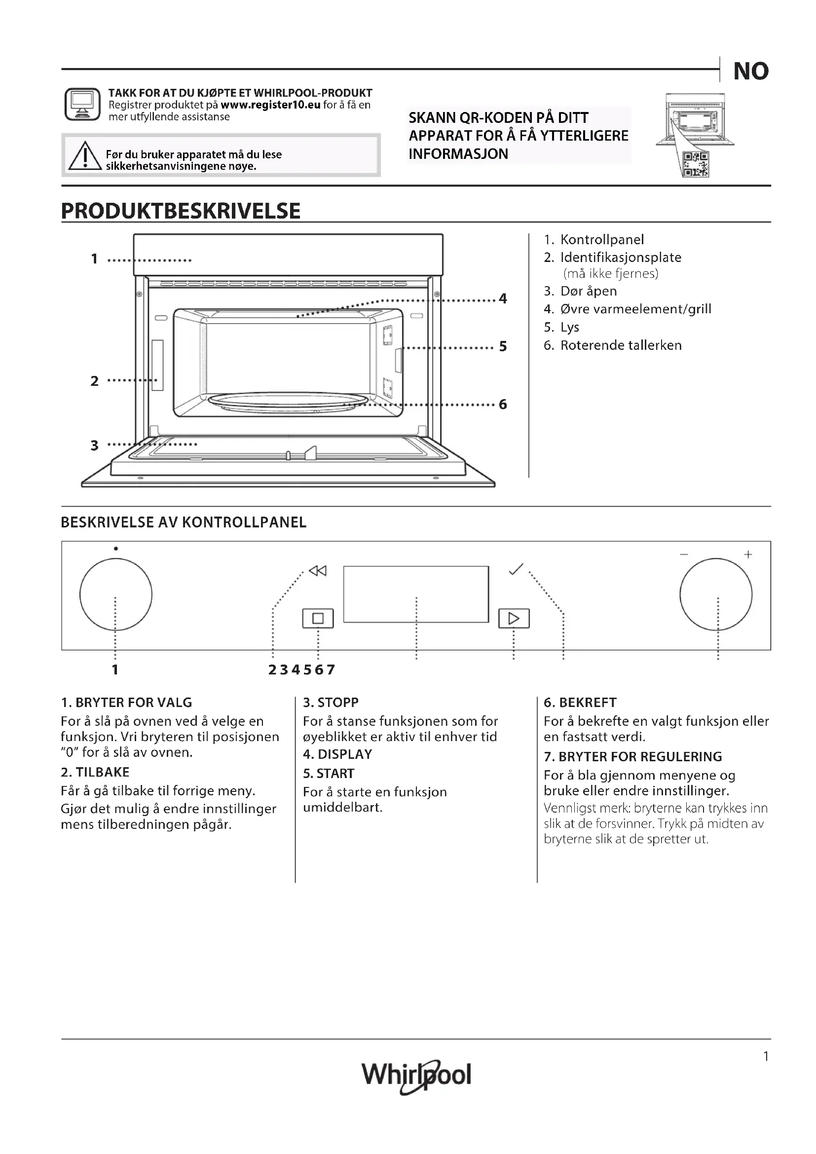 TAKK FOR AT DU KJØPTE ET WHIRLPOOL-PRODUKT Registrer produktet på www . register10 . eu for å få en mer utfyllende assistanse Før du bruker apparatet må du lese sikkerhetsanvisningene nøye.