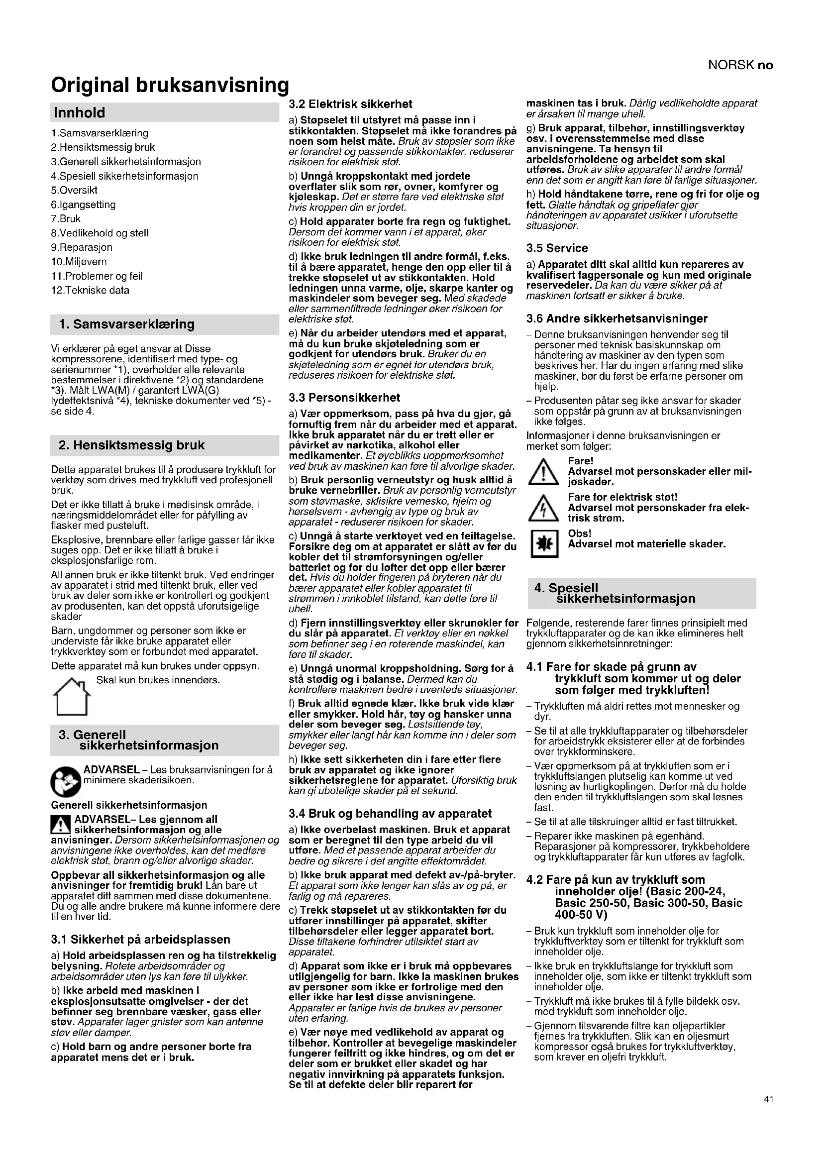 inneholder olje! (Basic 200-24, Basic 250-50, Basic 300-50, Basic 400-50 V) – Bruk kun trykkluft som inneholder olje for trykkluftverktøy som er tiltenkt for trykkluft som inneholder olje. – Ikke bruk en trykkluftslange for trykkluft som inneholder olje, som ikke er tiltenkt trykkluft som inneholder olje. – Trykkluft må ikke brukes til å fylle bildekk osv. med trykkluft som inneholder olje. – Gjennom tilsvarende filtre kan oljepartikler fjernes fra trykkluften. Slik kan en oljesmurt kompressor også brukes for trykkluftverktøy, som krever en oljefri trykkluft. Innhold