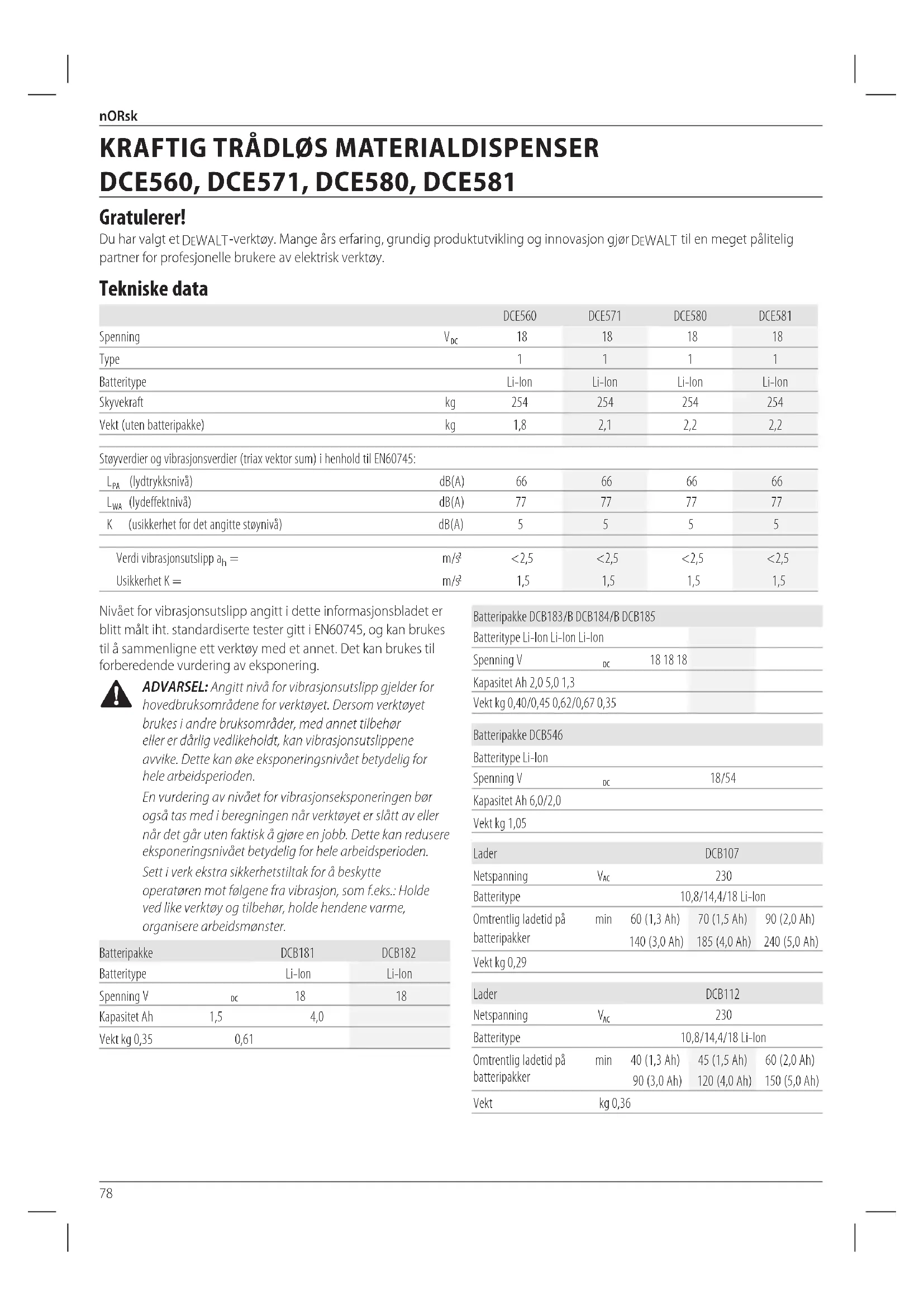 Gratulerer! Du har valgt et DeWALT -verktøy. Mange års erfaring, grundig produktutvikling og innovasjon gjør DeWALT til en meget pålitelig partner for profesjonelle brukere av elektriskverktøy. Tekniske data