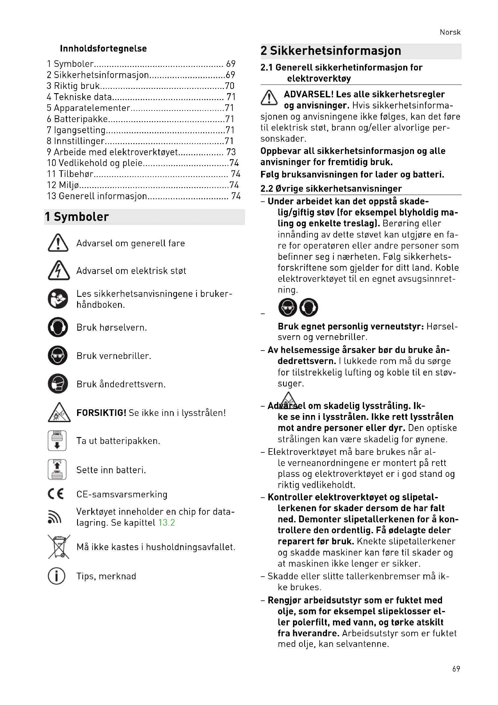 Bruk egnet personlig verneutstyr: Hørsel svern og vernebriller. – Av helsemessige årsaker bør du bruke ån dedrettsvern. I lukkede rom må du sørge for tilstrekkelig lufting og koble til en støv suger. – Advarsel om skadelig lysstråling. Ik ke se inn i lysstrålen. Ikke rett lysstrålen mot andre personer eller dyr. Den optiske strålingen kan være skadelig for øynene. – Elektroverktøyet må bare brukes når al le verneanordningene er montert på rett plass og elektroverktøyet er i god stand og riktig vedlikeholdt. – Kontroller elektroverktøyet og slipetal lerkenen for skader dersom de har falt ned. Demonter slipetallerkenen for å kon trollere den ordentlig. Få ødelagte deler reparert før bruk. Knekte slipetallerkener og skadde maskiner kan føre til skader og at maskinen ikke lenger er sikker. – Skadde eller slitte tallerkenbremser må ik ke brukes. – Rengjør arbeidsutstyr som er fuktet med olje, som for eksempel slipeklosser el ler polerfilt, med vann, og tørke atskilt fra hverandre. Arbeidsutstyr som er fuktet med olje, kan selvantenne. Norsk 69– Obs! Brannfare! Unngå overoppheting av emnet og slipemaskinen. Tøm alltid støv beholderen før pauser i arbeidet. Slipe støv i filterposen eller filteret til støv-/våt sugeren kan selvantenne under sliping ved ugunstige forhold som gnistregn. Faren er spesielt stor hvis slipestøvet er blandet med lakk- eller polyuretanrester eller an dre kjemiske stoffer og emnet er varmt et ter langvarig arbeid. – Bruk alltid en longlife-støvpose eller en Festool støvsuger med antistatisk suge slange(AS) sammen med elektroverktøy et. Lettere elektriske støt kan føre til at man skvetter og blir mindre oppmerksom, noe som kan forårsake ulykker. – Bruk kun de batteripakkene som er be regnet til formålet, og ikke bruk strø madaptere til dette batteridrevne elektro verktøyet. Ikke lad batteripakken med la dere fra andre produsenter. Bruker du tilbehør som ikke er godkjent av produsen ten, kan dette føre til elektrisk støt og/eller alvorlige ulykker.
