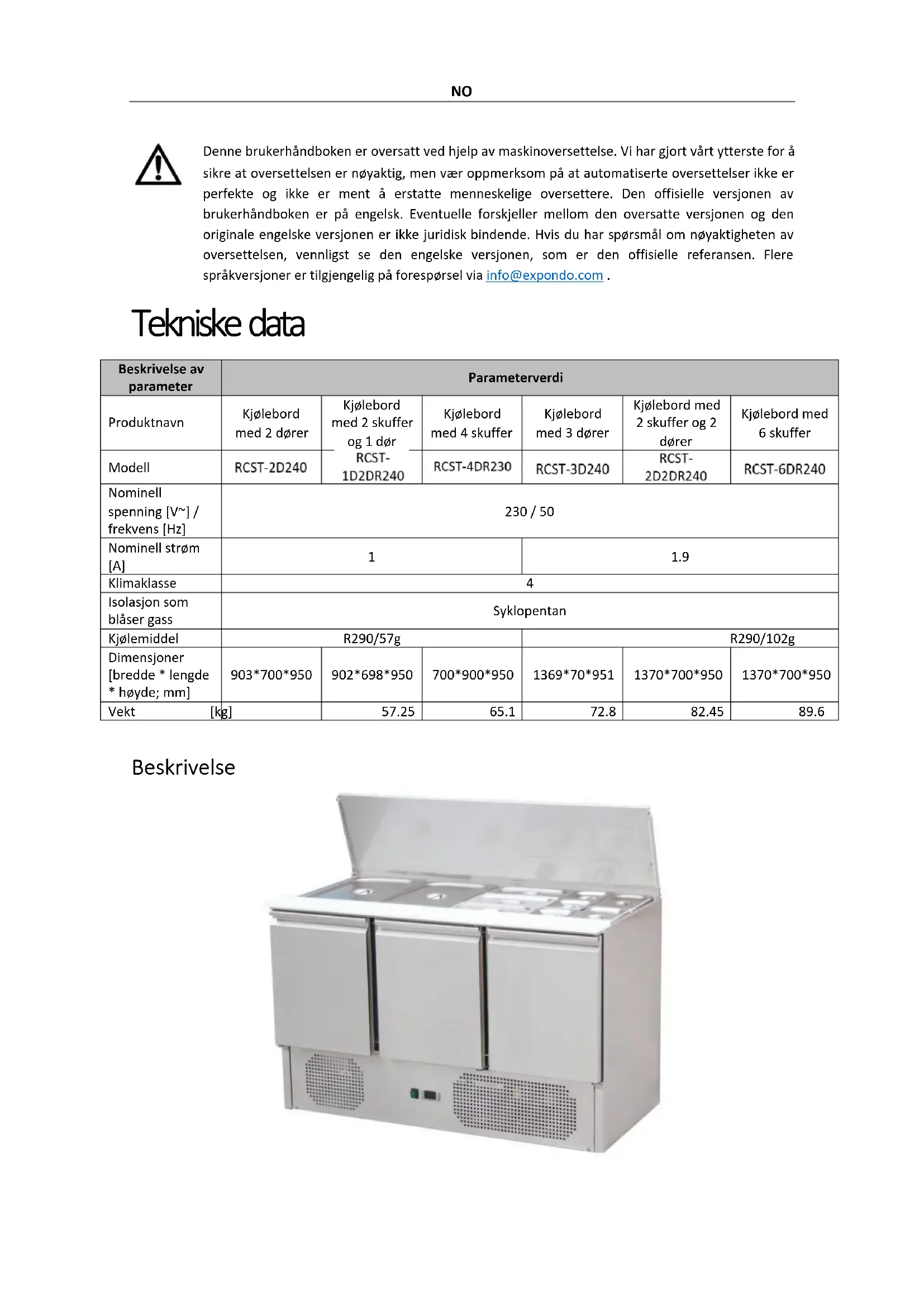 | Produktnavn | Kjølebord med 2 dører | Kjølebord med 2 skuffer og 1 dør | Kjølebord med 4 skuffer | Kjølebord med 3 dører | Kjølebord med 2 skuffer og 2 dører | Kjølebord med 6 skuffer |