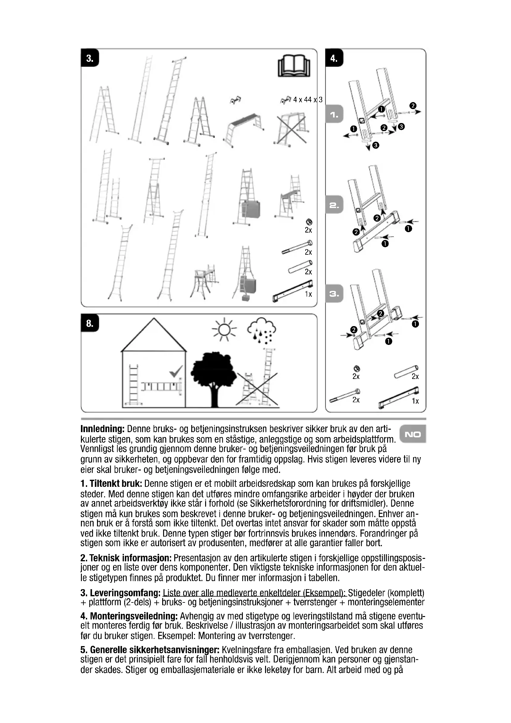 Innledning: Denne bruks- og betjeningsinstruksen beskriver sikker bruk av den arti- kulerte stigen, som kan brukes som en ståstige, anleggstige og som arbeidsplattform. Vennligst les grundig gjennom denne bruker- og betjeningsveiledningen før bruk på grunn av sikkerheten, og oppbevar den for framtidig oppslag. Hvis stigen leveres videre til ny eier skal bruker- og betjeningsveiledningen følge med.