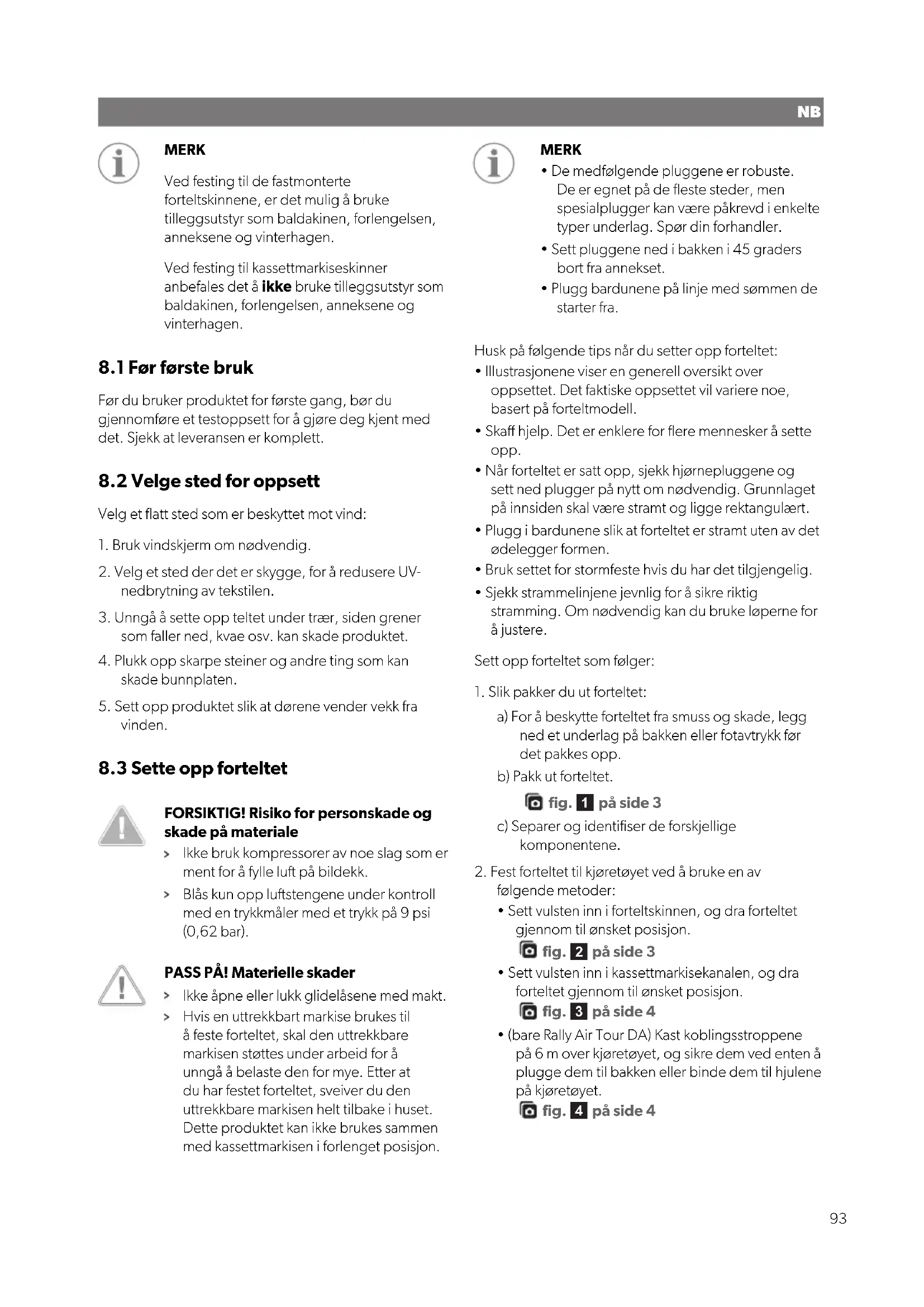 FORSIKTIG! Risiko for personskade og skade på materiale Ikke bruk kompressorer av noe slag som er ment for å fylle lu på bildekk. Blås kun opp lustengene under kontroll med en trykkmåler med et trykk på 9psi (0,62bar). PASS PÅ! Materielle skader Ikke åpne eller lukk glidelåsene med makt. Hvis en uttrekkbart markise brukes til å feste forteltet, skal den uttrekkbare markisen støttes under arbeid for å unngå å belaste den for mye. Etter at du har festet forteltet, sveiver du den uttrekkbare markisen helt tilbake i huset. Dette produktet kan ikke brukes sammen med kassettmarkisen i forlenget posisjon. MERK