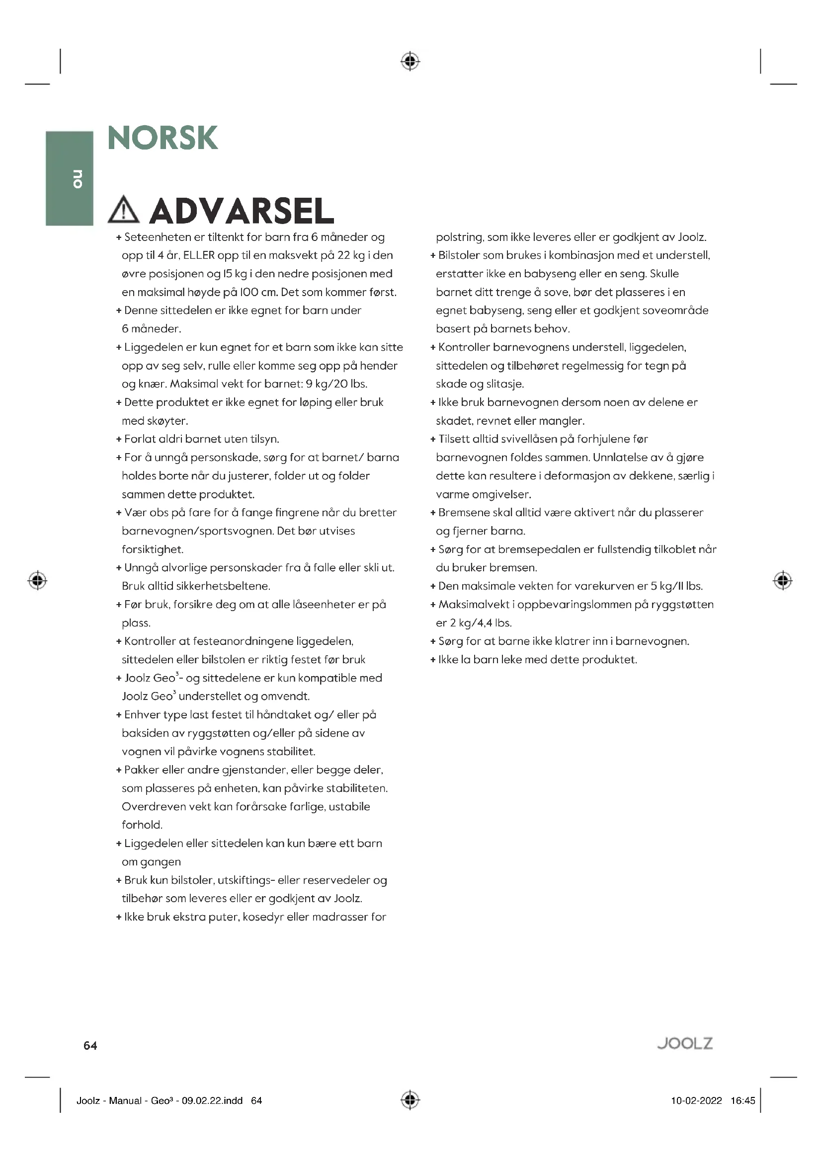 NORSK ADVARSEL + Seteenheten er tiltenkt for barn fra 6 måneder og opp til 4 år, ELLER opp til en maksvekt på 22 kg i den øvre posisjonen og 15 kg i den nedre posisjonen med en maksimal høyde på 100 cm. Det som kommer først. + Denne sittedelen er ikke egnet for barn under 6 måneder. + Liggedelen er kun egnet for et barn som ikke kan sitte opp av seg selv, rulle eller komme seg opp på hender og knær. Maksimal vekt for barnet: 9 kg/20 lbs. + Dette produktet er ikke egnet for løping eller bruk med skøyter. + Forlat aldri barnet uten tilsyn. + For å unngå personskade, sørg for at barnet/ barna holdes borte når du justerer, folder ut og folder sammen dette produktet. + Vær obs på fare for å fange ngrene når du bretter barnevognen/sportsvognen. Det bør utvises forsiktighet. + Unngå alvorlige personskader fra å falle eller skli ut. Bruk alltid sikkerhetsbeltene. + Før bruk, forsikre deg om at alle låseenheter er på plass. + Kontroller at festeanordningene liggedelen, sittedelen eller bilstolen er riktig festet før bruk + Joolz Geo³- og sittedelene er kun kompatible med Joolz Geo³ understellet og omvendt. + Enhver type last festet til håndtaket og/ eller på baksiden av ryggstøtten og/eller på sidene av vognen vil påvirke vognens stabilitet. + Pakker eller andre gjenstander, eller begge deler, som plasseres på enheten, kan påvirke stabiliteten. Overdreven vekt kan forårsake farlige, ustabile forhold. + Liggedelen eller sittedelen kan kun bære ett barn om gangen + Bruk kun bilstoler, utskiftings- eller reservedeler og tilbehør som leveres eller er godkjent av Joolz. + Ikke bruk ekstra puter, kosedyr eller madrasser for polstring, som ikke leveres eller er godkjent av Joolz. + Bilstoler som brukes i kombinasjon med et understell, erstatter ikke en babyseng eller en seng. Skulle barnet ditt trenge å sove, bør det plasseres i en egnet babyseng, seng eller et godkjent soveområde basert på barnets behov. + Kontroller barnevognens understell, liggedelen, sittedelen og tilbehøret regelmessig for tegn på skade og slitasje. + Ikke bruk barnevognen dersom noen av delene er skadet, revnet eller mangler. + Tilsett alltid svivellåsen på forhjulene før barnevognen foldes sammen. Unnlatelse av å gjøre dette kan resultere i deformasjon av dekkene, særlig i varme omgivelser. + Bremsene skal alltid være aktivert når du plasserer og fjerner barna. + Sørg for at bremsepedalen er fullstendig tilkoblet når du bruker bremsen. + Den maksimale vekten for varekurven er 5 kg/11 lbs. + Maksimalvekt i oppbevaringslommen på ryggstøtten er 2 kg/4,4 lbs. + Sørg for at barne ikke klatrer inn i barnevognen. + Ikke la barn leke med dette produktet. Joolz - Manual - Geo³ - 09.02.22.indd 64Joolz - Manual - Geo³ - 09.02.22.indd 64 10-02-2022 16:4510-02-2022 16:4565 instruction manual Joolz Geo