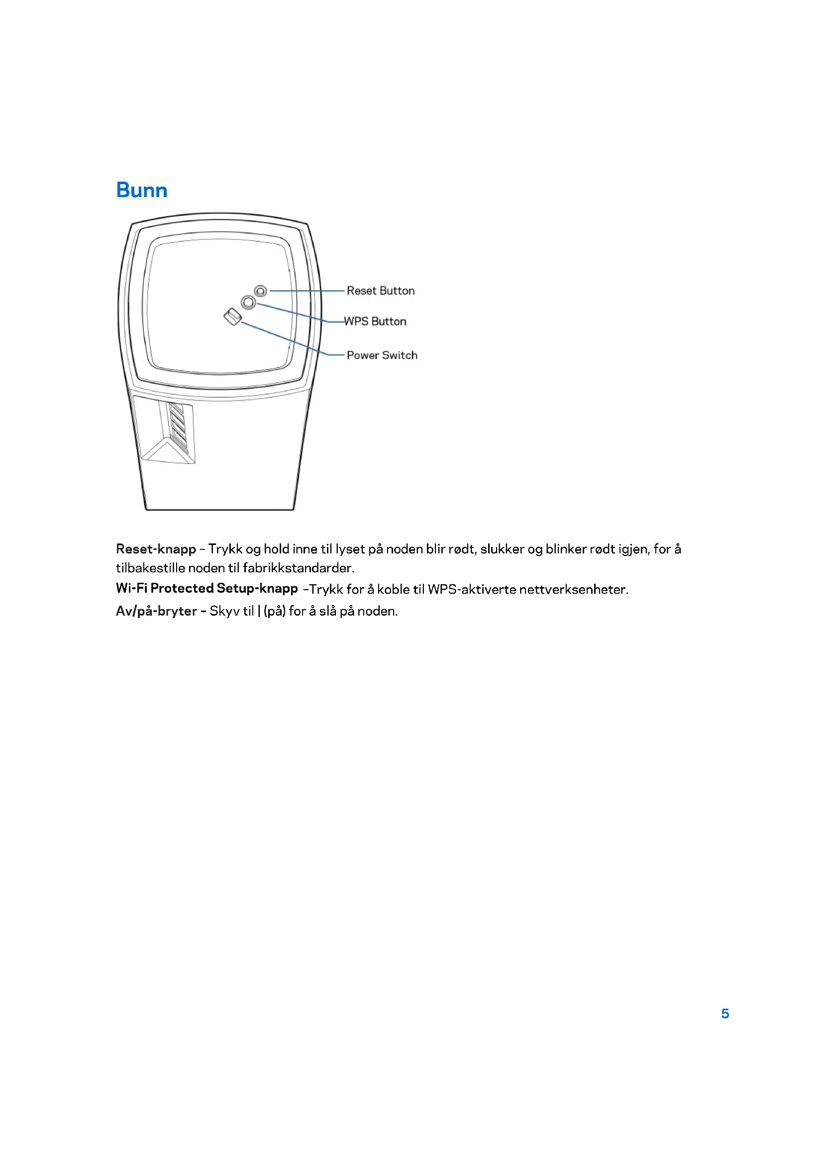 Reset-knapp – Trykk og hold inne til lyset på noden blir rødt, slukker og blinker rødt igjen, for å tilbakestille noden til fabrikkstandarder. Wi-Fi Protected Setup-knapp –Trykk for å koble til WPS-aktiverte nettverksenheter. Av/på-bryter – Skyv til | (på) for å slå på noden.6 Hjelp Her finner du mer hjelp