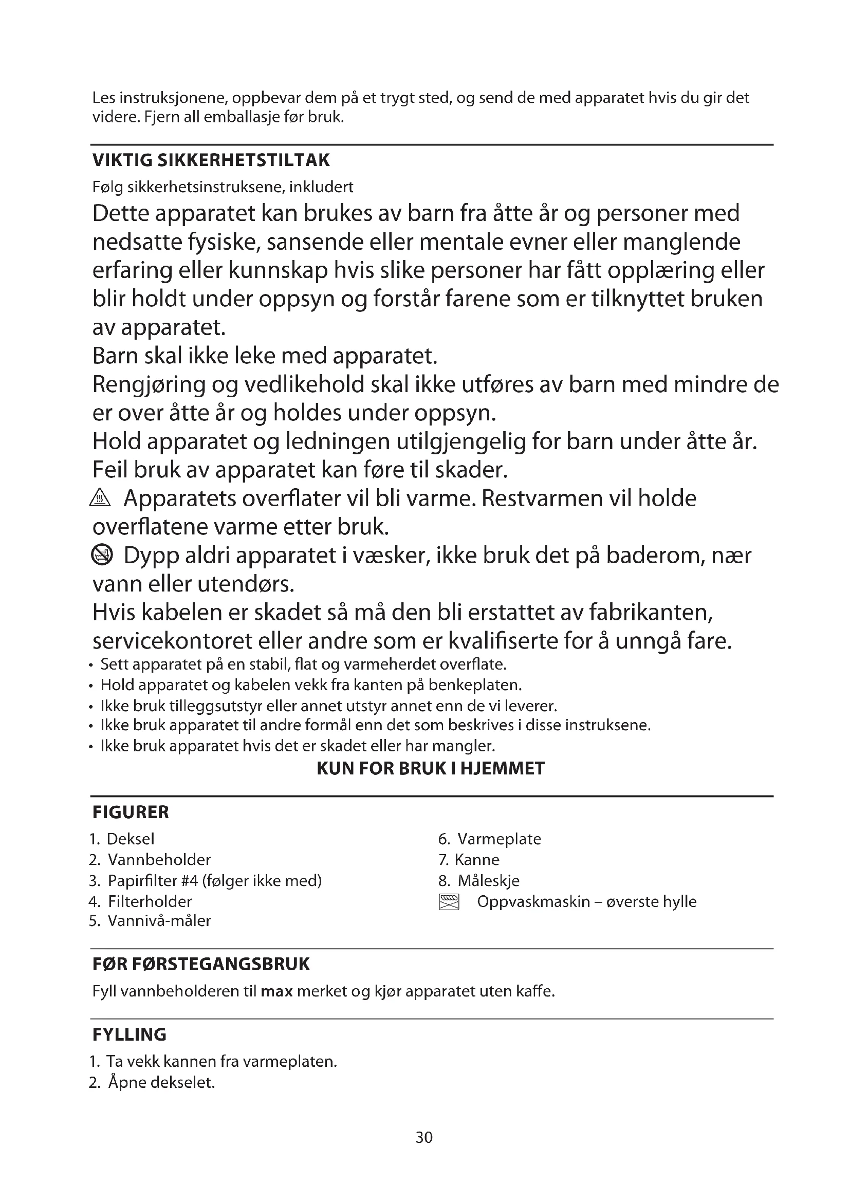 Fyll vannbeholderen til max merket og kjør apparatet uten kae. FYLLING