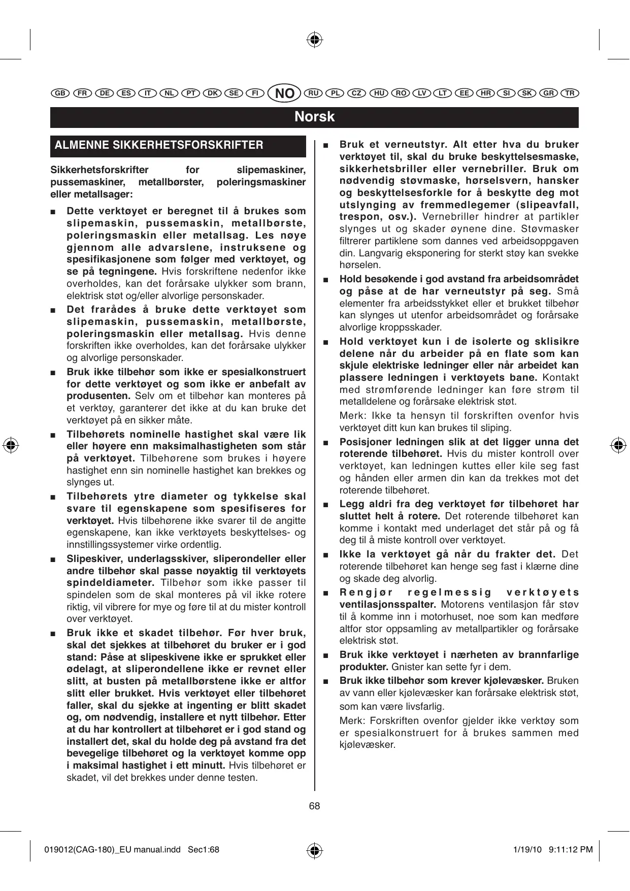 SPESIELLE SIKKERHETSFORSKRIFTER FOR VINKELSLIPERE