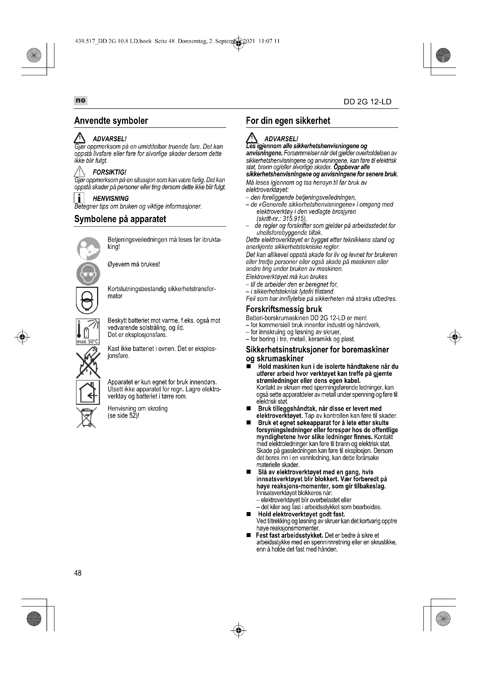 Batteri-borskrumaskinen DD 2G 12-LD er ment – for kommersiell bruk innenfor industri og håndverk, – for innskruing og løsning av skruer, – for boring i tre, metall, keramikk og plast. Sikkerhetsinstruksjoner for boremaskiner og skrumaskiner Hold maskinen kun i de isolerte håndtakene når du utfører arbeid hvor verktøyet kan treffe på gjemte strømledninger eller dens egen kabel. Kontakt av skruen med spenningsførende ledninger, kan også sette apparatdeler av metall under spenning og føre til elektrisk støt. Bruk tilleggshåndtak, når disse er levert med elektroverktøyet. Tap av kontrollen kan føre til skader. Bruk et egnet søkeapparat for å lete etter skulte forsyningsledninger eller forespør hos de offentlige myndighetene hvor slike ledninger finnes. Kontakt med elektroledninger kan føre til brann og elektrisk støt. Skade på gassledningen kan føre til eksplosjon. Dersom det bores inn i en vannledning, kan dette forårsake materielle skader. Slå av elektroverktøyet med en gang, hvis innsatsverktøyet blir blokkert. Vær forberedt på høye reaksjons-momenter, som gir tilbakeslag. Innsatsverktøyet blokkeres når: – elektroverktøyet blir overbelastet eller – det kiler seg fast i arbeidsstykket som bearbeides. Hold elektroverktøyet godt fast. Ved tiltrekking og løsning av skruer kan det kortvarig opptre høye reaksjonsmomenter. Fest fast arbeidsstykket. Det er bedre å sikre et arbeidsstykke med en spenninnretning eller en skrustikke, enn å holde det fast med hånden. Betjeningsveiledningen må leses før ibrukta- king! Øyevern må brukes! Kortslutningsbestandig sikkerhetstransfor- mator Beskytt batteriet mot varme, f.eks. også mot vedvarende solstråling, og ild. Det er eksplosjonsfare. Kast ikke batteriet i ovnen. Det er eksplos- jonsfare. Apparatet er kun egnet for bruk innendørs. Utsett ikke apparatet for regn. Lagre elektro- verktøy og batteriet i tørre rom. Henvisning om skroting (se side 52)! 439.517_DD 2G 10.8 LD.book Seite 48 Donnerstag, 2. September 2021 11:07 11DD 2G 12-LD