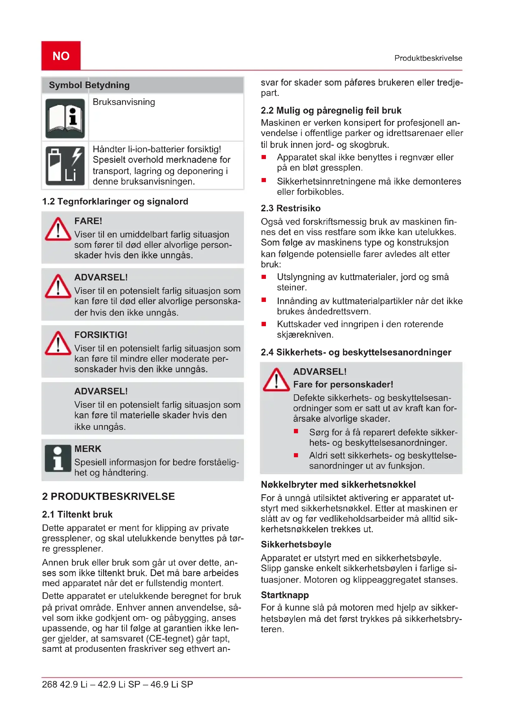 Symbol Betydning Les grundig gjennom bruksanvis- ningen før oppstart. Dette er forut- setningen for sikkert arbeid og feilfri håndtering.NO 268 42.9 Li – 42.9 Li SP – 46.9 Li SP Produktbeskrivelse Symbol Betydning Bruksanvisning