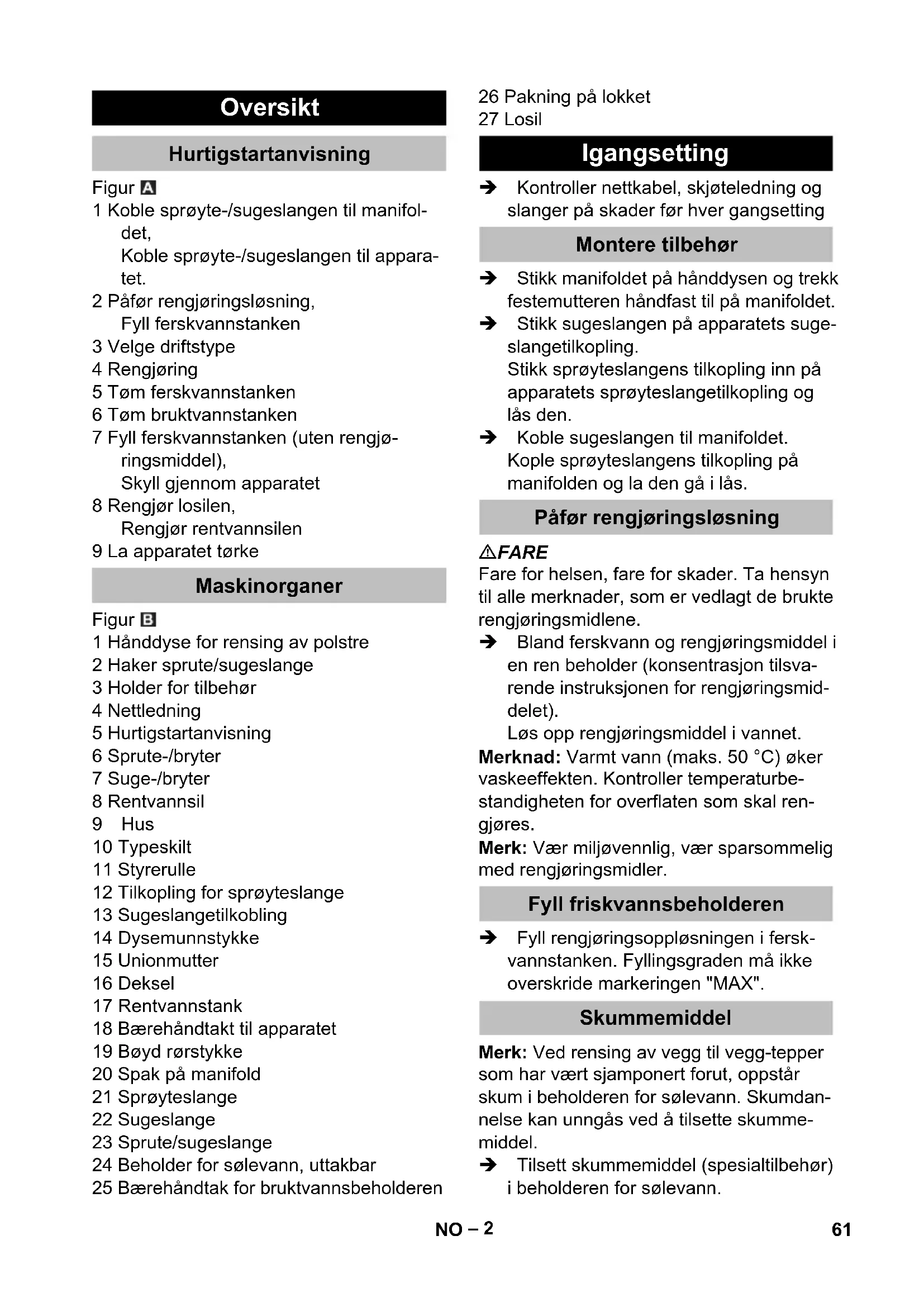 EU 6.647-263.0 7,5 m GB 6.647-264.0 7,5 m CH 6.647-265.0 7,5 m 59DA– 1 Før første gangs bruk av appa- ratet, les denne originale bruks- anvisningen, følg den og oppbevar den for senere bruk eller for overlevering til neste eier. – Det er tvingende nødvendig å lese sik- kerhetsinstruksene nr. 5.956-251.0 før maskinen settes i drift! – Hvis bruksanvisningen og sikkerhets- anvisningene ikke følges, kan dette medføre skader på apparatet og fare for brukeren og andre personer. – Informer straks forhandleren ved trans- portskader. Anvisninger om innhold (REACH) Aktuell informasjon om stoffene i innholdet finner du under: www.kaercher.com/REACH FARE Anvisning om en umiddelbar truende fare som kan føre til store personskader eller til død. 몇 ADVARSEL Anvisning om en mulig farlig situasjon som kan føre til store personskader eller til død. 몇 FORSIKTIG Anvisning om en mulig farlig situasjon som kan føre til mindre personskader. OBS Anvisning om en mulig farlig situasjon som kan føre til materielle skader. Dette spruteekstraksjonsapparat er ment for kommersiell bruk som våtrengjørings- apparat i henhold til denne bruksanvisnin- gen, så vel som under hensyntagen til sik- kerhetsanvisningene for børsterengjørings- apparater og tepperensere. Innholdsfortegnelse Miljøvern . . . . . . . . . . . . . . . . . NO 1 Risikotrinn . . . . . . . . . . . . . . . . NO 1 Forskriftsmessig bruk . . . . . . . NO 1 Oversikt. . . . . . . . . . . . . . . . . . NO 2 Igangsetting . . . . . . . . . . . . . . NO 2 Betjening. . . . . . . . . . . . . . . . . NO 3 Vaskemetoder. . . . . . . . . . . . . NO 3 Transport. . . . . . . . . . . . . . . . . NO 4 Lagring . . . . . . . . . . . . . . . . . . NO 4 Pleie og vedlikehold . . . . . . . . NO 4 Feilretting . . . . . . . . . . . . . . . . NO 5 Tilbehør og reservedeler. . . . . NO 5 Garanti . . . . . . . . . . . . . . . . . . NO 5 EU-samsvarserklæring . . . . . . NO 6 Tekniske data . . . . . . . . . . . . . NO 7 Miljøvern Materialet i emballasjen kan re- sirkuleres. Ikke kast emballasjen i husholdningsavfallet, men le- ver den inn til resirkulering. Gamle apparater inneholder ver- difulle materialer som kan resir- kuleres. Disse bør leveres inn til gjenvinning. Batterier, olje og lig- nende stoffer må ikke komme ut i miljøet. Gamle maskiner skal derfor avhendes i egnede inn- samlingssystemer. Risikotrinn Forskriftsmessig bruk 60 NO– 2 Figur 1 Koble sprøyte-/sugeslangen til manifol- det, Koble sprøyte-/sugeslangen til appara- tet. 2 Påfør rengjøringsløsning, Fyll ferskvannstanken 3 Velge driftstype 4 Rengjøring 5 Tøm ferskvannstanken 6 Tøm bruktvannstanken 7 Fyll ferskvannstanken (uten rengjø- ringsmiddel), Skyll gjennom apparatet 8 Rengjør losilen, Rengjør rentvannsilen 9 La apparatet tørke Figur 1 Hånddyse for rensing av polstre 2 Haker sprute/sugeslange 3 Holder for tilbehør 4 Nettledning 5 Hurtigstartanvisning 6 Sprute-/bryter 7 Suge-/bryter 8 Rentvannsil 9Hus 10 Typeskilt 11 Styrerulle 12 Tilkopling for sprøyteslange 13 Sugeslangetilkobling 14 Dysemunnstykke 15 Unionmutter 16 Deksel 17 Rentvannstank 18 Bærehåndtakt til apparatet 19 Bøyd rørstykke 20 Spak på manifold 21 Sprøyteslange 22 Sugeslange 23 Sprute/sugeslange 24 Beholder for sølevann, uttakbar 25 Bærehåndtak for bruktvannsbeholderen 26 Pakning på lokket 27 Losil Kontroller nettkabel, skjøteledning og slanger på skader før hver gangsetting Stikk manifoldet på hånddysen og trekk festemutteren håndfast til på manifoldet. Stikk sugeslangen på apparatets suge- slangetilkopling. Stikk sprøyteslangens tilkopling inn på apparatets sprøyteslangetilkopling og lås den. Koble sugeslangen til manifoldet. Kople sprøyteslangens tilkopling på manifolden og la den gå i lås. FARE Fare for helsen, fare for skader. Ta hensyn til alle merknader, som er vedlagt de brukte rengjøringsmidlene. Bland ferskvann og rengjøringsmiddel i en ren beholder (konsentrasjon tilsva- rende instruksjonen for rengjøringsmid- delet). Løs opp rengjøringsmiddel i vannet. Merknad: Varmt vann (maks. 50 °C) øker vaskeeffekten. Kontroller temperaturbe- standigheten for overflaten som skal ren- gjøres. Merk: Vær miljøvennlig, vær sparsommelig med rengjøringsmidler. Fyll rengjøringsoppløsningen i fersk- vannstanken. Fyllingsgraden må ikke overskride markeringen "MAX". Merk: Ved rensing av vegg til vegg-tepper som har vært sjamponert forut, oppstår skum i beholderen for sølevann. Skumdan- nelse kan unngås ved å tilsette skumme- middel. Tilsett skummemiddel (spesialtilbehør) i beholderen for sølevann. Oversikt Hurtigstartanvisning Maskinorganer Igangsetting Montere tilbehør Påfør rengjøringsløsning Fyll friskvannsbeholderen Skummemiddel 61NO– 3 Sett i støpselet. Trykk suge-/bryteren for å kople inn suge-/turbinen. Trykk sprute-/bryteren for å kople inn sprøytepumpen. OBS Fare for skade. Prøv gjenstanden som skal renses på motstandsdyktighet mot vann og fargeekthet, på et lite synlig sted før bruk. Betjen spaken på albuen for å sprøyte på rengjøringsløsning. Kjør over flaten som skal rengjøres i overlappende baner. Derved trekkes dysen bakover (ikke skyve). Ved veksling av dysen kan hånddysen bli stukket inn i holderen for tilbehør. Kople sprute-/bryter og suge-/bryter ut. Trekk ut nettstøpselet. Er beholderen for sølevann full, koples suge-/bryter og sprute-/bryter ut. Ta av dekselet. Ta bruktvannsbeholderen ut av appara- tet og tøm den. Slå av maskinen. Betjen kort spaken på bendet for å re- dusere trykket. Skill bendet fra sprute/sugeslangen. Heng sugeslangen.i ferskvannstanken. Trykk suge-/bryteren for å kople inn suge-/turbinen. Sug ferskvannstanken tom og kople ap- paratet ut. Ta av dekselet. Ta bruktvannsbeholderen ut av appara- tet og tøm den. Forbind manifoldet (med hånddyse) med sugeslangen. Kople sprøyteslangens tilkopling på manifolden og la den gå i lås. Fyll ca. 2 liter ledningsvann i fersk- vannstanken. Ikke tilfør 