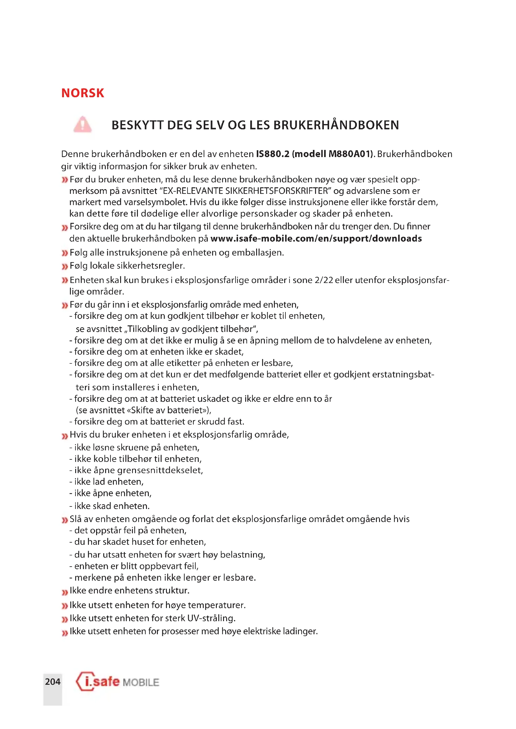 HANDELSMERKEN i.safeMOBILEGmbH en het i.safeMOBILEGmbH-logo zijn merken van i.safeMOBILEGmbH. Geleverd met de Google™- app en Google Chrome™. Google en Google Chrome zijn handelsmerken van Google LLC. Android is een handelsmerk van Google LLC. Alle andere merken en auteursrechten zijn eigendom van hun betreende houders.204 NORSK BESKYTT DEG SELV OG LES BRUKERHÅNDBOKEN Denne brukerhåndboken er en del av enheten IS880.2 (modell M880A01). Brukerhåndboken gir viktig informasjon for sikker bruk av enheten. Før du bruker enheten, må du lese denne brukerhåndboken nøye og vær spesielt opp- merksom på avsnittet “EX-RELEVANTE SIKKERHETSFORSKRIFTER” og advarslene som er markert med varselsymbolet. Hvis du ikke følger disse instruksjonene eller ikke forstår dem, kan dette føre til dødelige eller alvorlige personskader og skader på enheten. Forsikre deg om at du har tilgang til denne brukerhåndboken når du trenger den. Du nner den aktuelle brukerhåndboken på www.isafe-mobile.com/en/support/downloads Følg alle instruksjonene på enheten og emballasjen. Følg lokale sikkerhetsregler. Enheten skal kun brukes i eksplosjonsfarlige områder i sone 2/22 eller utenfor eksplosjonsfar- lige områder. Før du går inn i et eksplosjonsfarlig område med enheten, - forsikre deg om at kun godkjent tilbehør er koblet til enheten, se avsnittet „Tilkobling av godkjent tilbehør“, - forsikre deg om at det ikke er mulig å se en åpning mellom de to halvdelene av enheten, - forsikre deg om at enheten ikke er skadet, - forsikre deg om at alle etiketter på enheten er lesbare, - forsikre deg om at det kun er det medfølgende batteriet eller et godkjent erstatningsbat- teri som installeres i enheten, - forsikre deg om at at batteriet uskadet og ikke er eldre enn to år (se avsnittet «Skifte av batteriet»), - forsikre deg om at batteriet er skrudd fast. Hvis du bruker enheten i et eksplosjonsfarlig område, - ikke løsne skruene på enheten, - ikke koble tilbehør til enheten, - ikke åpne grensesnittdekselet, - ikke lad enheten, - ikke åpne enheten, - ikke skad enheten. Slå av enheten omgående og forlat det eksplosjonsfarlige området omgående hvis - det oppstår feil på enheten, - du har skadet huset for enheten, - du har utsatt enheten for svært høy belastning, - enheten er blitt oppbevart feil, - merkene på enheten ikke lenger er lesbare. Ikke endre enhetens struktur. Ikke utsett enheten for høye temperaturer. Ikke utsett enheten for sterk UV-stråling. Ikke utsett enheten for prosesser med høye elektriske ladinger.NO