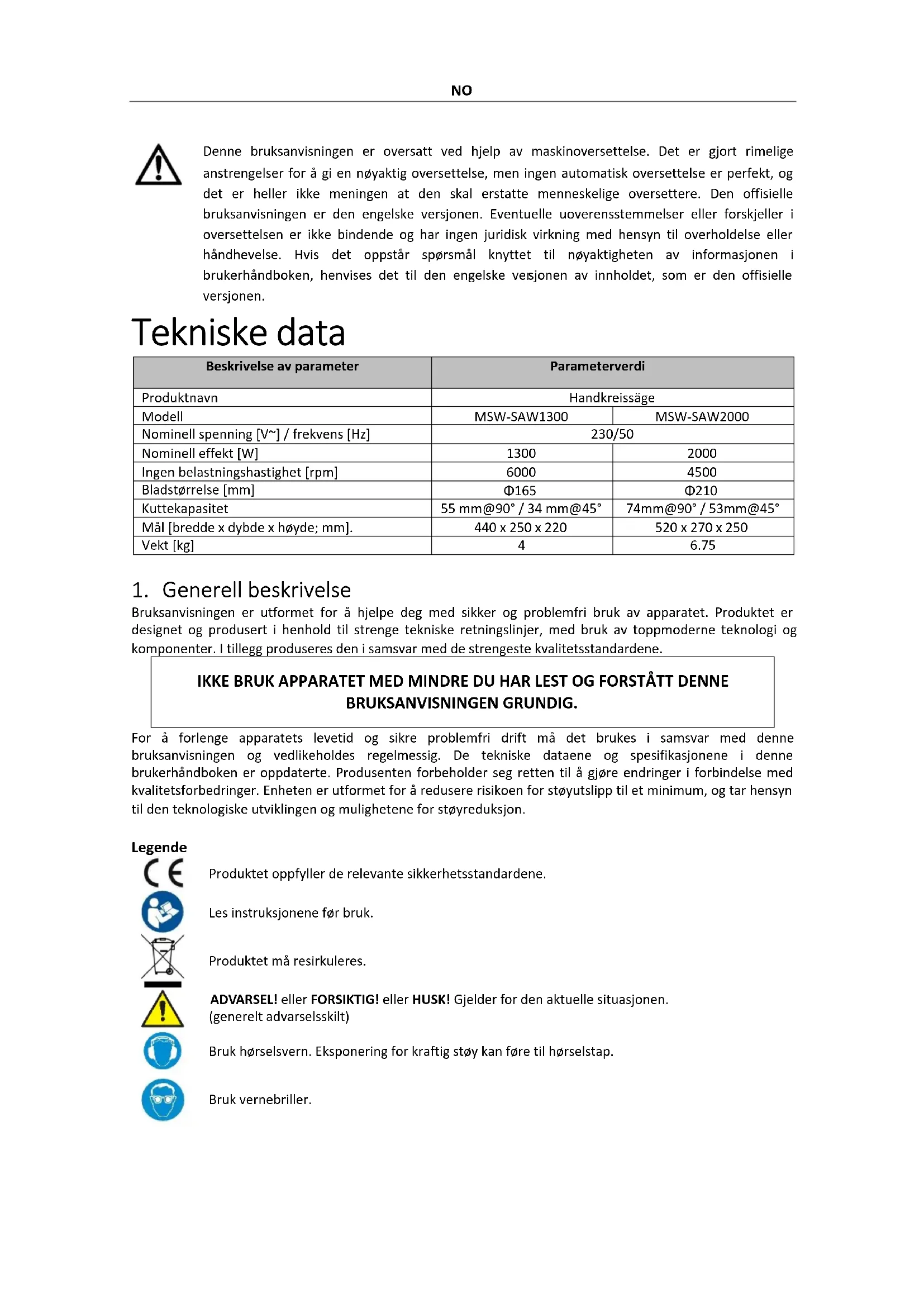 Bruksanvisningen er utformet for å hjelpe deg med sikker og problemfri bruk av apparatet. Produktet er designet og produsert i henhold til strenge tekniske retningslinjer, med bruk av toppmoderne teknologi og komponenter. I tillegg produseres den i samsvar med de strengeste kvalitetsstandardene. IKKE BRUK APPARATET MED MINDRE DU HAR LEST OG FORSTÅTT DENNE BRUKSANVISNINGEN GRUNDIG. For å forlenge apparatets levetid og sikre problemfri drift må det brukes i samsvar med denne bruksanvisningen og vedlikeholdes regelmessig. De tekniske dataene og spesifikasjonene i denne brukerhåndboken er oppdaterte. Produsenten forbeholder seg retten til å gjøre endringer i forbindelse med kvalitetsforbedringer. Enheten er utformet for å redusere risikoen for støyutslipp til et minimum, og tar hensyn til den teknologiske utviklingen og mulighetene for støyreduksjon. Legende