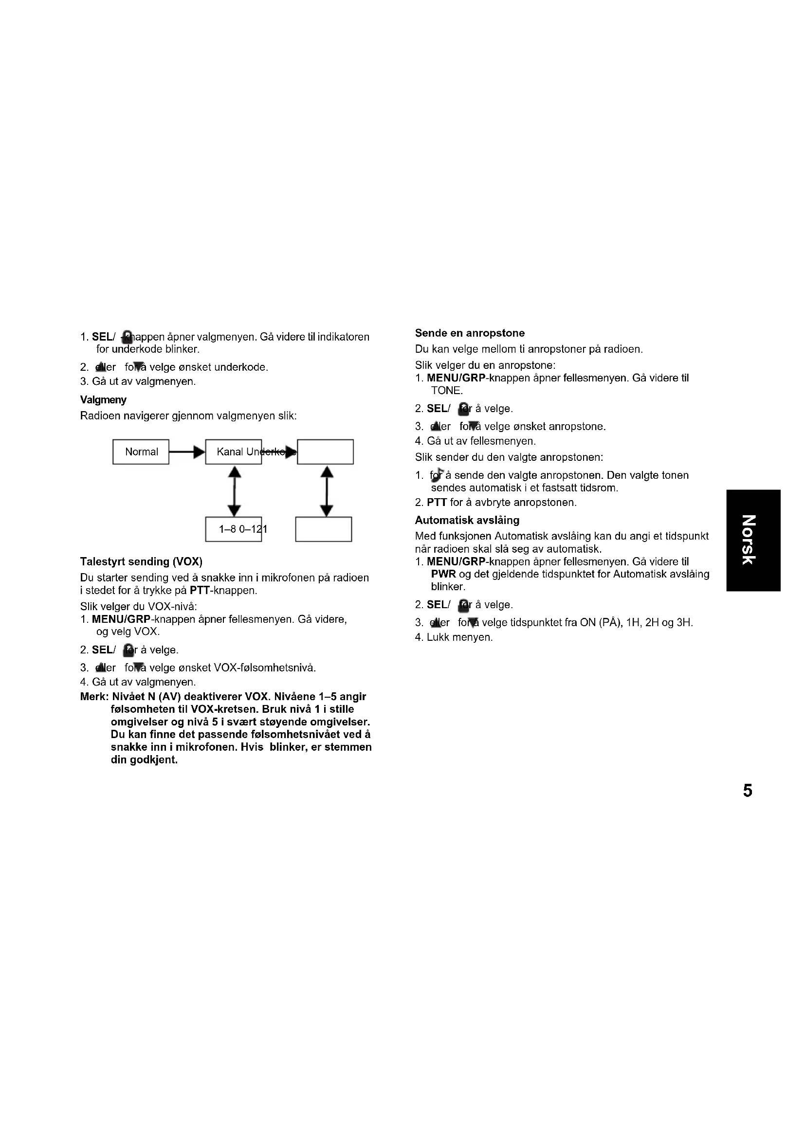Valgmeny Radioen navigerer gjennom valgmenyen slik: Talestyrt sending (VOX) Du starter sending ved å snakke inn i mikrofonen på radioen i stedet for å trykke på PTT-knappen. Slik velger du VOX-nivå: