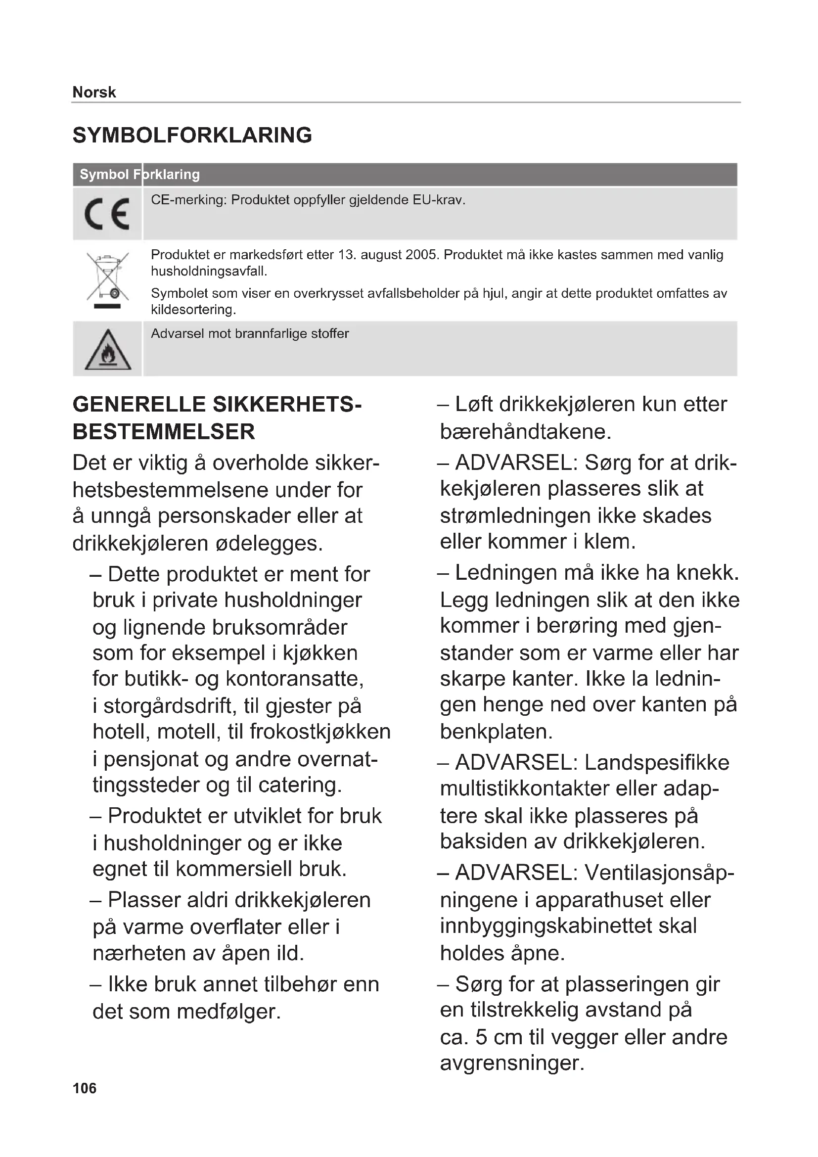 ELEKTRISKE OG ELEKTRONISKE APPARATER Dette symbolet betyr at dette produktet ikke skal kastes sammen med usortert husholdningsav- fall. Det nnes et separat (gratis) system for innsamling og mottak av kasserte elektriske og elektroniske apparater. Kontakt kommuneadministrasjonen eller forretningen hvor du kjøpte produktet, hvis du ønsker mer informasjon. Når du sørger for at dette produktet blir avhendet i samsvar med regelverket, bidrar du til å hindre eventuelle negative påvirkninger på miljø og helse, og til å bevare våre naturlige ressurser. ADVARSEL, brannfare, eksplosjonsfare: Drikkekjøleren inneholder kjø- lemiddel og olje som er brann- farlige. Kjølemiddel og olje som lekker ut, kan begynne å brenne i tilstrekkelig høye konsentrasjoner og i kontakt med en ekstern varmekilde. Rørledningene i kjølemiddel- kretsen og kompressoren må være helt fri for skader. Ekspansjonsgass i isolasjon (Cyclopentan) er brennbar!