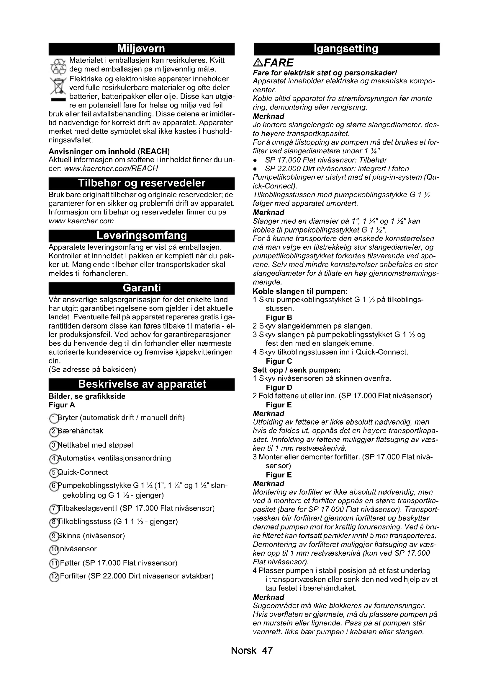 Stell og vedlikehold FARE Fare for elektrisk støt og personskader! Apparatet inneholder elektriske og mekaniske kompo- nenter. Rengjøring og brukervedlikehold skal ikke utføres av barn. Bruksområde SP 17.000 Flat nivåsensor SP 22.000 Dirt nivåsensor Sjakter med en diameter på < ca. 1 m (f.eks. avløp) nivåsensor i øver- ste posisjon nivåsensor i øver- ste posisjon Bruk av forfilter anbefales Forfilterluker stengt (beskyttel- se mot tilsmus- sing) Svømmebas- seng, diker (kun SP 22.000 Dirt ni- våsensor) nivåsensor i nederste posisjon nivåsensor i nederste posisjon Start pumping med forfilter eller utfoldede føtter Forfilterluker stengt (beskyttel- se mot tilsmus- sing) Fortsett pumping uten forfilter og innfoldede føtter (restvæskenivå 1 mm oppnås) Merknad Gjennomfør i ma- nuell modus. Overvåk utkoblin- gen / flatsugin- gen. Bruksområde SP 17.000 Flat nivåsensor SP 22.000 Dirt nivåsensorNorsk 49 Spyling og rengjøring OBS Fare for skader! Fare for skader på grunn av tørket smuss eller tilset- ningsstoffer. Spyl og rengjør apparatet rett etter hver bruk. 1 Dersom det ble transportert tilsmusset væske eller væske med tilsetningsstoffer, må apparatet spyles etterpå: Bruk apparatet til å transportere rent fersk- vann uten tilsetningsstoffer til alt smuss eller alle til- setningsstoffer er spylt ut av apparatet. FARE Fare for elektrisk støt og personskader! Apparatet inneholder elektriske og mekaniske kompo- nenter. Koble alltid apparatet fra strømforsyningen før monte- ring, demontering eller rengjøring. 2 Trekk støpselet ut av stikkontakten. 3 Trykk på tasten for Quick-Connect og trekk av tilkob- lingsstussene. Figur C 4 Fjern ev. rester fra slangen og Quick-Connect. 5 Rengjør utsiden av apparatet med en myk, ren klut og rent ferskvann. 6 Tøm apparatet og tilbehøret og la dem tørke. Vedlikehold Apparatet er vedlikeholdsfritt. Transport Transport for hånd 몇 FORSIKTIG Fare for personskader på ved snubling! Det er alltid fare for å snuble i løse kabler og slanger. Vær oppmerksom på kabler og slanger når du flytter en- heten.