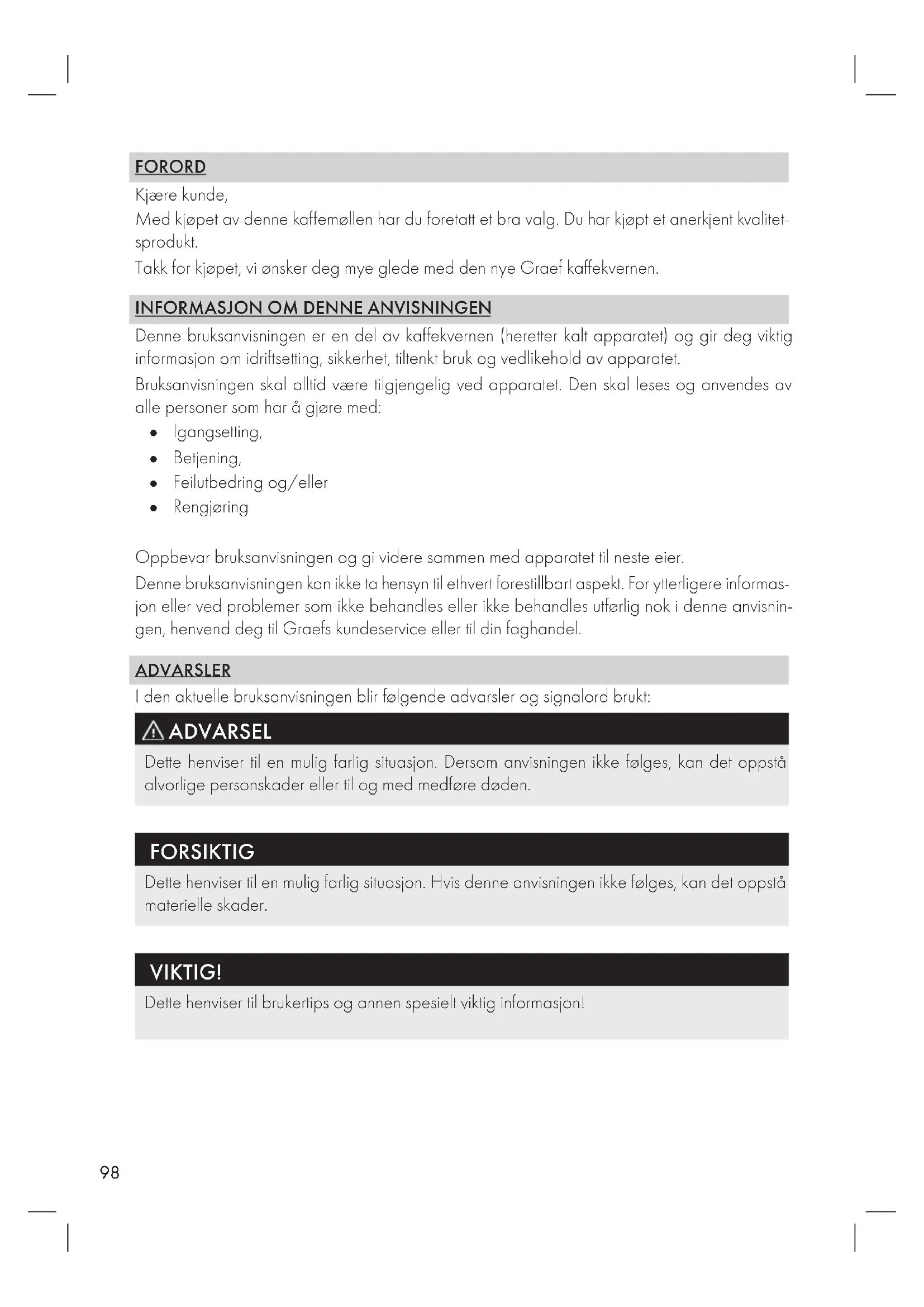Denne bruksanvisningen er en del av kaffekvernen (heretter kalt apparatet) og gir deg viktig informasjon om idriftsetting, sikkerhet, tiltenkt bruk og vedlikehold av apparatet. Bruksanvisningen skal alltid være tilgjengelig ved apparatet. Den skal leses og anvendes av alle personer som har å gjøre med: ● Igangsetting, ● Betjening, ● Feilutbedring og/eller ● Rengjøring Oppbevar bruksanvisningen og gi videre sammen med apparatet til neste eier. Denne bruksanvisningen kan ikke ta hensyn til ethvert forestillbart aspekt. For ytterligere informas- jon eller ved problemer som ikke behandles eller ikke behandles utførlig nok i denne anvisnin- gen, henvend deg til Graefs kundeservice eller til din faghandel. ADVARSLER I den aktuelle bruksanvisningen blir følgende advarsler og signalord brukt: ADVARSEL Dette henviser til en mulig farlig situasjon. Dersom anvisningen ikke følges, kan det oppstå alvorlige personskader eller til og med medføre døden. FORSIKTIG Dette henviser til en mulig farlig situasjon. Hvis denne anvisningen ikke følges, kan det oppstå materielle skader. VIKTIG! Dette henviser til brukertips og annen spesielt viktig informasjon!99
