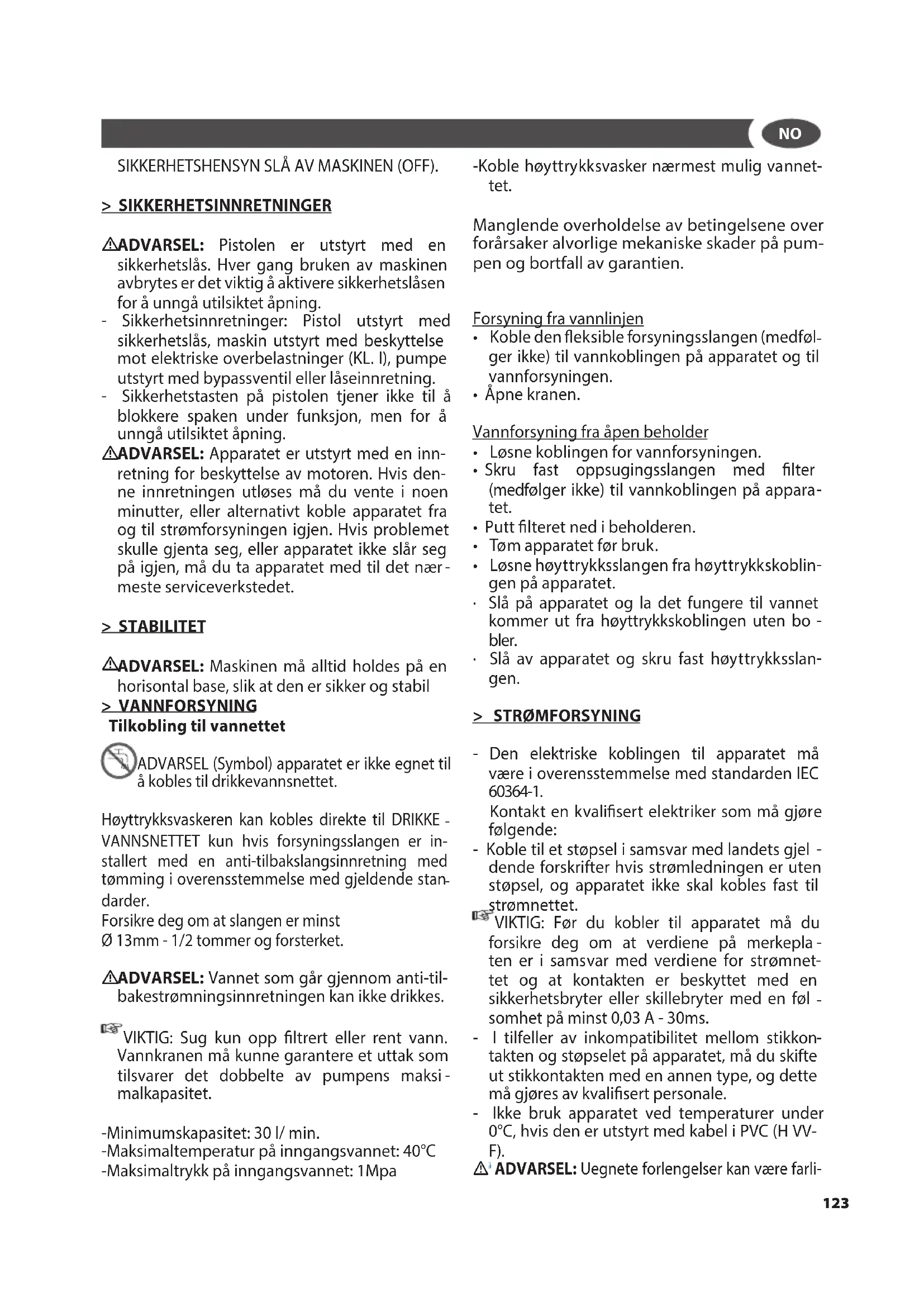ren ikke har blitt leid ut eller på annen måte har blitt brukt på kommersiell/profesjonell måte. Følgende er unntatt fra garantien: - Deler som er gjenstand for normal slitasje. - Høyttrykksslangen og ekstra tilbehør. - Skader som følge av ulykker transport, uaktsom eller upassende behandling, feilaktig eller upassende bruk eller installasjon, ikke i overensstemmelse med advarslene som er gitt i instruksjonsveiledningen. - Garantien omfatter ikke eventuell rengjøring av funksjonselementene. En reparasjon under garanti omfatter utskiftning av defekte deler, mens spedisjon og emballasje ikke omfattes. Utskifting av apparatet og forlengelse av garantien etter et inngrep er unntatt. Produsenten fraskriver seg ethvert ansvar for eventuelle skader på personer eller gjenstander som skyldes feilaktig installasjon eller bruk av apparatet. ADVARSEL! Defekter som tette dyser, maskiner som er blokkert på grunn av rester av kalk, skadet tilbehør (f.eks. bøyd slange), og/eller maskiner som ikke har tegn på defekter ER IKKE DEKKET AV GARANTIEN. > AVSKAFFELSE Nytt miljøvern direktiv 2012/19/EU: I den hensikt å bevare våre omgivelser og verne folkehelsen, skal avfall av elektrisk og elektronisk materiell tas hånd om i samsvar med spesikke regler og i samvirke mellom leverandører og brukere. Av den grunn, som angitt med symbolet på merkelappen eller utenpå emballasje, skal du ikke kvitte deg med ap