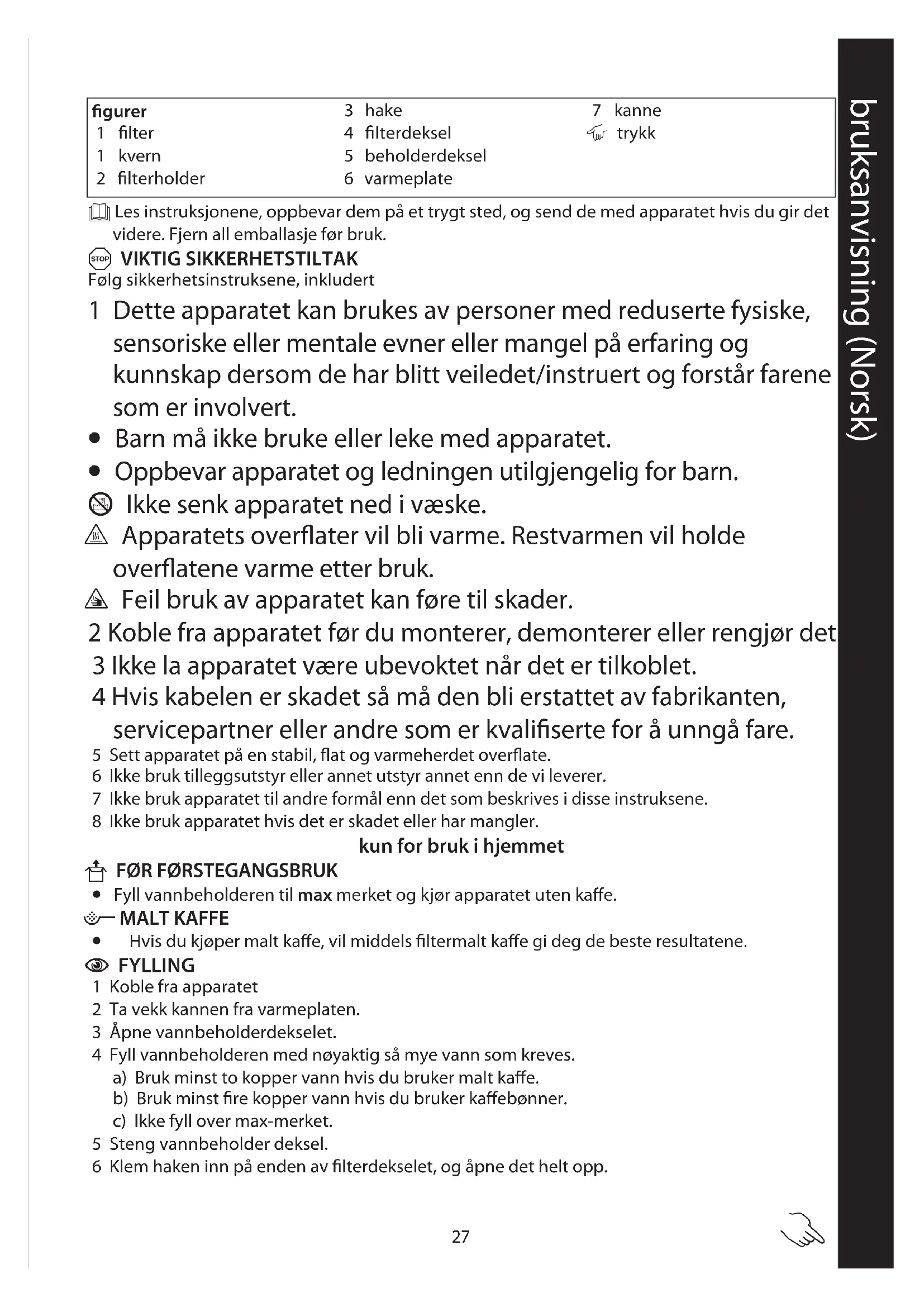 - Hvis du kjøper malt kaffe, vil middels filtermalt kaffe gi deg de beste resultatene. C FYLLING 1 Koble fra apparatet 2 Ta vekk kannen fra varmeplaten. 3 Åpne vannbeholderdekselet. 4 Fyll vannbeholderen med nøyaktig så mye vann som kreves. a) Bruk minst to kopper vann hvis du bruker malt kaffe. b) Bruk minst fire kopper vann hvis du bruker kaffebønner. c) Ikke fyll over max-merket. 5 Steng vannbeholder deksel. 6 Klem haken inn på enden av filterdekselet, og åpne det helt opp. bruksanvisning (Norsk) figurer 1 filter 1 kvern 2 filterholder 3 hake 4 filterdeksel 5 beholderdeksel 6 varmeplate 7 kanne | trykk28 7 Legg nøyaktig mengde kaffe i filteret. a) Bruk én strøken spiseskje malt kaffe for hver kopp. b) Bruk én toppet spiseskje med hele bønner for hver kopp. c) Antall spiseskjeer kaffe må samsvare med antall kopper vann. 8 Lukk filterdekslet, og trykk det ned for å feste haken.