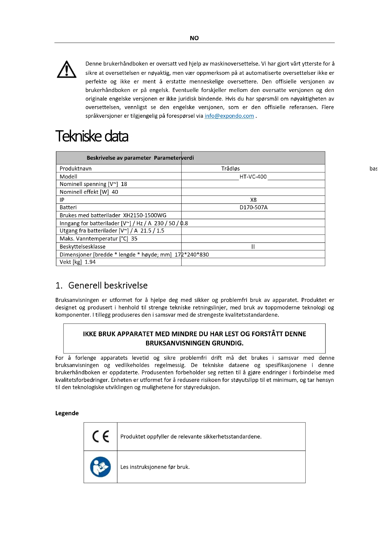 Bruksanvisningen er utformet for å hjelpe deg med sikker og problemfri bruk av apparatet. Produktet er designet og produsert i henhold til strenge tekniske retningslinjer, med bruk av toppmoderne teknologi og komponenter. I tillegg produseres den i samsvar med de strengeste kvalitetsstandardene. IKKE BRUK APPARATET MED MINDRE DU HAR LEST OG FORSTÅTT DENNE BRUKSANVISNINGEN GRUNDIG. For å forlenge apparatets levetid og sikre problemfri drift må det brukes i samsvar med denne bruksanvisningen og vedlikeholdes regelmessig. De tekniske dataene og spesifikasjonene i denne brukerhåndboken er oppdaterte. Produsenten forbeholder seg retten til å gjøre endringer i forbindelse med kvalitetsforbedringer. Enheten er utformet for å redusere risikoen for støyutslipp til et minimum, og tar hensyn til den teknologiske utviklingen og mulighetene for støyreduksjon. Legende Produktet oppfyller de relevante sikkerhetsstandardene. Les instruksjonene før bruk.NO Produktet må resirkuleres. ADVARSEL! eller FORSIKTIG! eller HUSK! Gjelder for den aktuelle situasjonen. (generelt advarselsskilt) OBS! Advarsel om elektrisk støt! OBS! Les alle sikkerhetsinstruksjoner og alle bruksanvisninger. Unnlatelse av å følge advarslene og instruksjonene kan føre til elektrisk støt, brann og/eller alvorlige personskader eller dødsfall. Begrepene "enhet" eller "produkt" brukes i advarslene og instruksjonene for å referere til: Trådløs bassengstøvsuger 1.1. Elektrisk sikkerhet a) Støpselet må passe til stikkontakten. Ikke modifiser støpselet på noen måte. Bruk av originale støpsler og tilhørende stikkontakter reduserer risikoen for elektrisk støt. b) Unngå å berøre jordede elementer som rør, varmeovner, kjeler og kjøleskap. Det er en økt risiko for elektrisk støt hvis den jordede enheten utsettes for regn, kommer i direkte kontakt med en våt overflate eller brukes i fuktige omgivelser. Hvis det kommer vann inn i apparatet, øker risikoen for skade på apparatet og for elektrisk støt. c) Ikke berør enheten med våte eller fuktige hender når den er koblet til laderen. d) Bruk kabelen kun til det den er beregnet for. Bruk den aldri til å bære apparatet eller til å trekke støpselet ut av stikkontakten. Hold kabelen unna varmekilder, olje, skarpe kanter eller bevegelige deler. Skadede eller sammenfiltrede kabler øker risikoen for elektrisk støt. e) Slutt å bruke hvis strømledningen eller adapteren er skadet eller viser tegn på slitasje. En skadet strømforsyning må skiftes ut. En skadet strømledning bør skiftes ut av en kvalifisert elektriker eller produsentens servicesenter. f) Ikke bruk produktet når det er mennesker i vannet. g) Ved lading, sørg for at apparatet er koblet til en stikkontakt på et sted hvor det ikke er fare for oversvømmelse, og som er beskyttet mot fuktighet. h) Slå av produktet før lading.