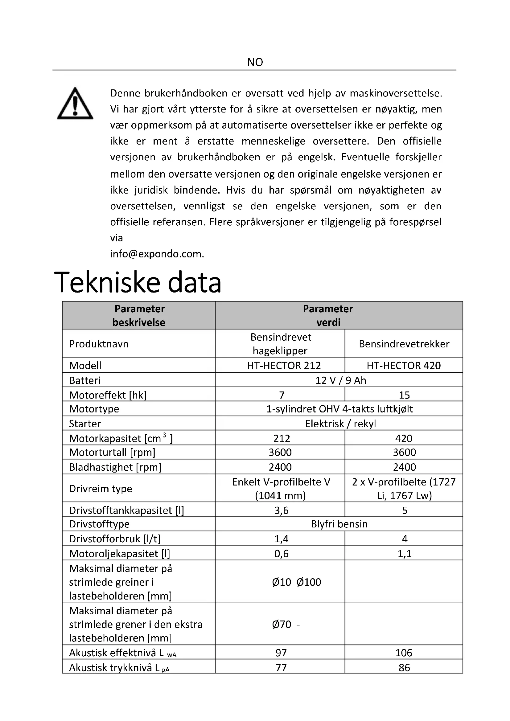 Denne brukerhåndboken er oversatt ved hjelp av maskinoversettelse. Vi har gjort vårt ytterste for å sikre at oversettelsen er nøyaktig, men vær oppmerksom på at automatiserte oversettelser ikke er perfekte og ikke er ment å erstatte menneskelige oversettere. Den offisielle versjonen av brukerhåndboken er på engelsk. Eventuelle forskjeller mellom den oversatte versjonen og den originale engelske versjonen er ikke juridisk bindende. Hvis du har spørsmål om nøyaktigheten av oversettelsen, vennligst se den enge lske versjonen, som er den offisielle referansen. Flere språkversjoner er tilgjengelig på forespørsel via info@expondo.com. Tekniske data Parameter beskrivelse Parameter verdi Produktnavn Bensindrevet hageklipper Bensindrevetrekker Modell HT-HECTOR 212 HT-HECTOR 420 Batteri 12 V / 9 Ah Motoreffekt [hk]