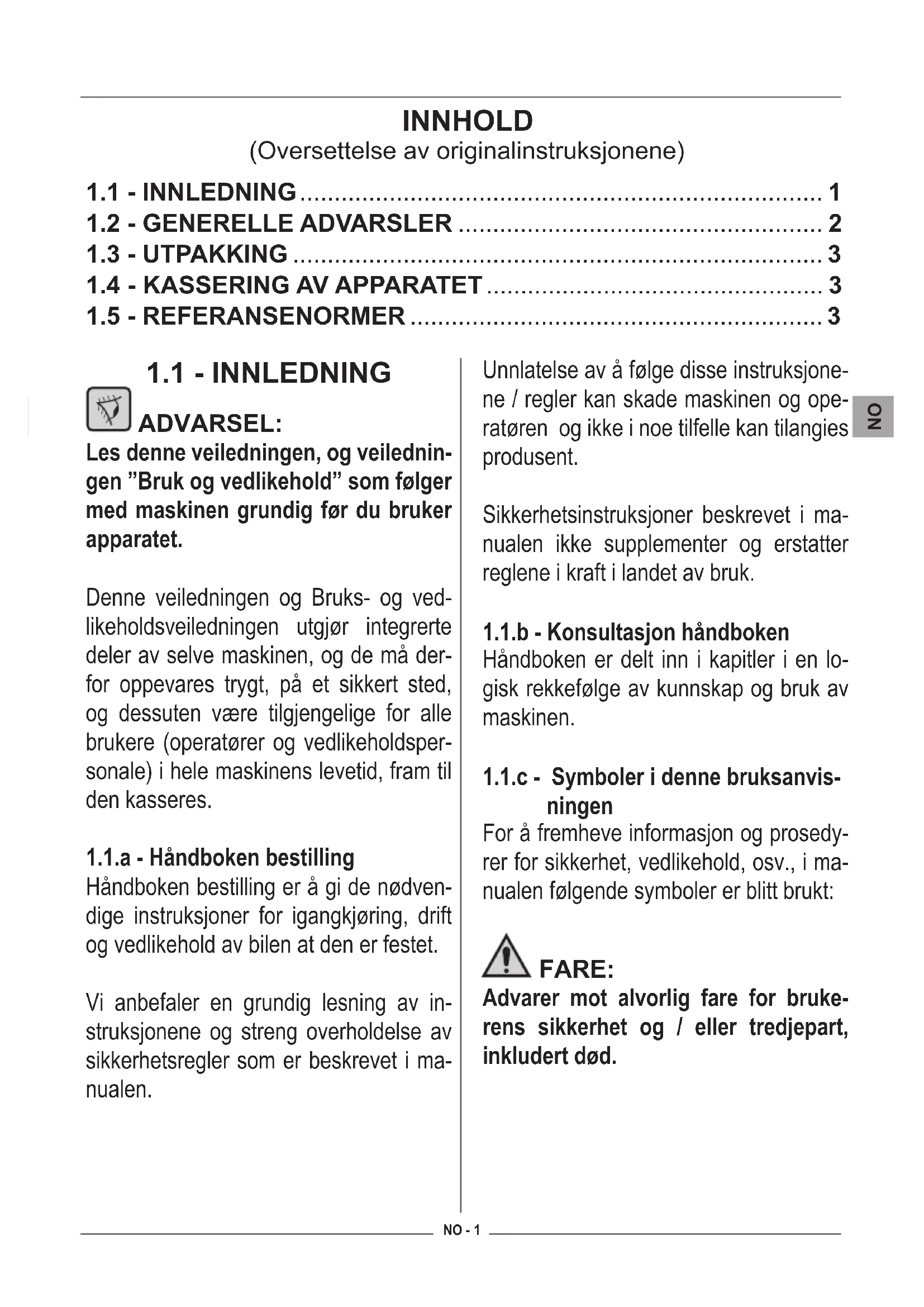 ningen For å fremheve informasjon og prosedy- rer for sikkerhet, vedlikehold, osv., i ma- nualen følgende symboler er blitt brukt: FARE: Advarer mot alvorlig fare for bruke- rens sikkerhet og / eller tredjepart, inkludert død. INNHOLD (Oversettelse av originalinstruksjonene)