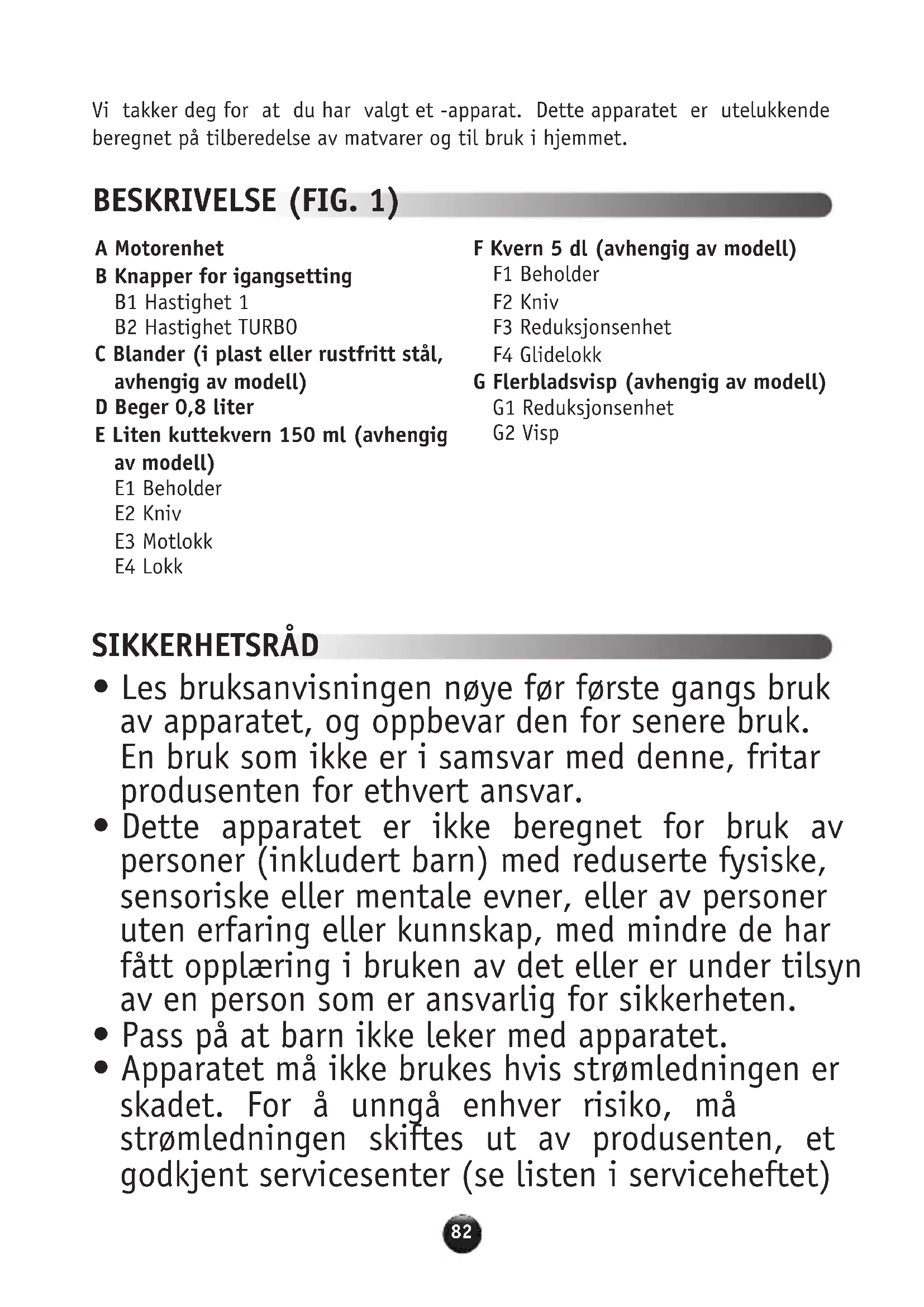 - Apparatet må ikke brukes hvis strømledningen er skadet. For å unngå enhver risiko, må strømledningen skiftes ut av produsenten, et godkjent servicesenter (se listen i serviceheftet) A Motorenhet B Knapper for igangsetting B1 Hastighet 1 B2 Hastighet TURBO C Blander (i plast eller rustfritt stål, avhengig av modell) D Beger 0,8 liter E Liten kuttekvern 150 ml (avhengig av modell) E1 Beholder E2 Kniv E3 Motlokk E4 Lokk F Kvern 5 dl (avhengig av modell) F1 Beholder F2 Kniv F3 Reduksjonsenhet F4 Glidelokk G Flerbladsvisp (avhengig av modell) G1 Reduksjonsenhet G2 Vispeller av personer med tilsvarende kvalifikasjoner.