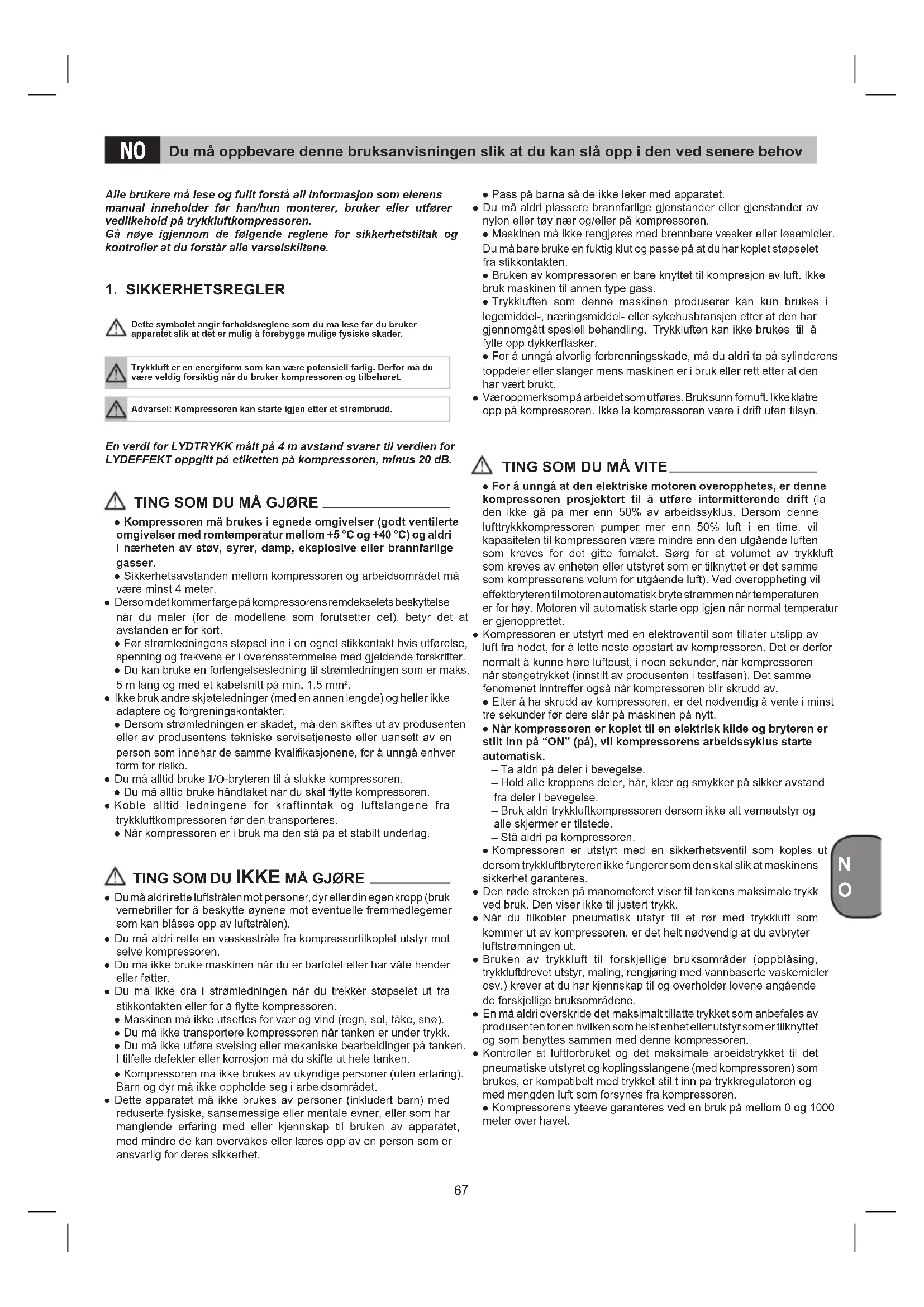● For å unngå at den elektriske motoren overopphetes, er denne kompressoren prosjektert til å utføre intermitterende drift (la den ikke gå på mer enn 50% av arbeidssyklus. Dersom denne lufttrykkkompressoren pumper mer enn 50% luft i en time, vil kapasiteten til kompressoren være mindre enn den utgående luften som kreves for det gitte fomålet. Sørg for at volumet av trykkluft som kreves av enheten eller utstyret som er tilknyttet er det samme som kompressorens volum for utgående luft). Ved overoppheting vil effektbryteren til motoren automatisk bryte strømmen når temperaturen er for høy. Motoren vil automatisk starte opp igjen når normal temperatur er gjenopprettet. ● Kompressoren er utstyrt med en elektroventil som tillater utslipp av luft fra hodet, for å lette neste oppstart av kompressoren. Det er derfor normalt å kunne høre luftpust, i noen sekunder, når kompressoren når stengetrykket (innstilt av produsenten i testfasen). Det samme fenomenet inntreffer også når kompressoren blir skrudd av. ● Etter å ha skrudd av kompressoren, er det nødvendig å vente i minst tre sekunder før dere slår på maskinen på nytt. ● Når kompressoren er koplet til en elektrisk kilde og bryteren er stilt inn på “ON” (på), vil kompressorens arbeidssyklus starte automatisk. – Ta aldri på deler i bevegelse. – Hold alle kroppens deler, hår, klær og smykker på sikker avstand fra deler i bevegelse. – Bruk aldri trykkluftkompressoren dersom ikke alt verneutstyr og alle skjermer er tilstede. – Stå aldri på kompressoren. ● Kompressoren er utstyrt med en sikkerhetsventil som koples ut dersom trykkluftbryteren ikke fungerer som den skal slik at maskinens sikkerhet garanteres. ● Den røde streken på manometeret viser til tankens maksimale trykk ved bruk. Den viser ikke til justert trykk. ● Når du tilkobler pneumatisk utstyr til et rør med trykkluft som kommer ut av kompressoren, er det helt nødvendig at du avbryter luftstrømningen ut. ● Bruken av trykkluft til forskjellige bruksområder (oppblåsing, trykkluftdrevet utstyr, maling, rengjøring med vannbaserte vaskemidler osv.) krever at du har kjennskap til og overholder lovene angående de forskjellige bruksområdene. ● En må aldri overskride det maksimalt tillatte trykket som anbefales av produsenten for en hvilken som helst enhet eller utstyr som er tilknyttet og som benyttes sammen med denne kompressoren. ● Kontroller at luftforbruket og det maksimale arbeidstrykket til det pneumatiske utstyret og koplingsslangene (med kompressoren) som brukes, er kompatibelt med trykket stil t inn på trykkregulatoren og med mengden luft som forsynes fra kompressoren. ● Kompressorens yteeve garanteres ved en bruk på mellom 0 og 1000 meter over havet. Du må oppbevare denne bruksanvisningen slik at du kan slå opp i den ved senere behov NO68