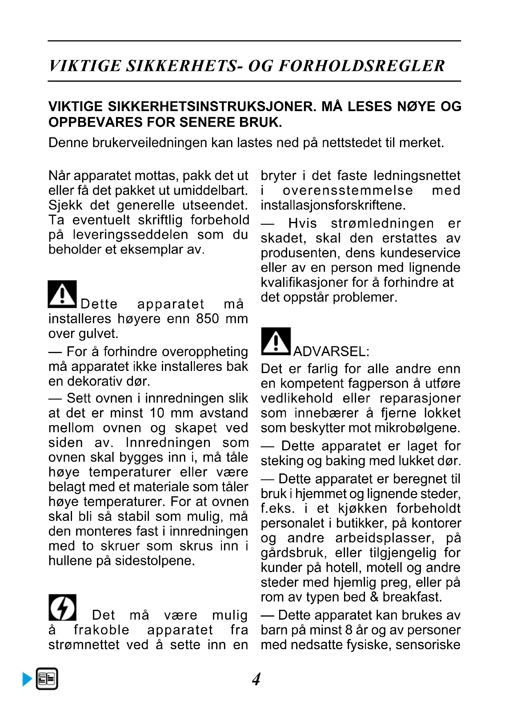 Når apparatet mottas, pakk det ut eller få det pakket ut umiddelbart. Sjekk det generelle utseendet. Ta eventuelt skriftlig forbehold på leveringsseddelen som du beholder et eksemplar av. Dette apparatet må installeres høyere enn 850 mm over gulvet. — For å forhindre overoppheting må apparatet ikke installeres bak en dekorativ dør. — Sett ovnen i innredningen slik at det er minst 10 mm avstand mellom ovnen og skapet ved siden av. Innredningen som ovnen skal bygges inn i, må tåle høye temperaturer eller være belagt med et materiale som tåler høye temperaturer. For at ovnen skal bli så stabil som mulig, må den monteres fast i innredningen med to skruer som skrus inn i hullene på sidestolpene. Det må være mulig å frakoble apparatet fra strømnettet ved å sette inn en bryter i det faste ledningsnettet i overensstemmelse med installasjonsforskriftene. — Hvis strømledningen er skadet, skal den erstattes av produsenten, dens kundeservice eller av en person med lignende kvalikasjoner for å forhindre at det oppstår problemer. ADVARSEL: Det er farlig for alle andre enn en kompetent fagperson å utføre vedlikehold eller reparasjoner som innebærer å fjerne lokket som beskytter mot mikrobølgene. — Dette apparatet er laget for steking og baking med lukket dør. — Dette apparatet er beregnet til bruk i hjemmet og lignende steder, f.eks. i et kjøkken forbeholdt personalet i butikker, på kontorer og andre arbeidsplasser, på gårdsbruk, eller tilgjengelig for kunder på hotell, motell og andre steder med hjemlig preg, eller på rom av typen bed & breakfast. — Dette apparatet kan brukes av barn på minst 8 år og av personer med nedsatte fysiske, sensoriske VIKTIGE SIKKERHETSINSTRUKSJONER. MÅ LESES NØYE OG OPPBEVARES FOR SENERE BRUK. Denne brukerveiledningen kan lastes ned på nettstedet til merket.5