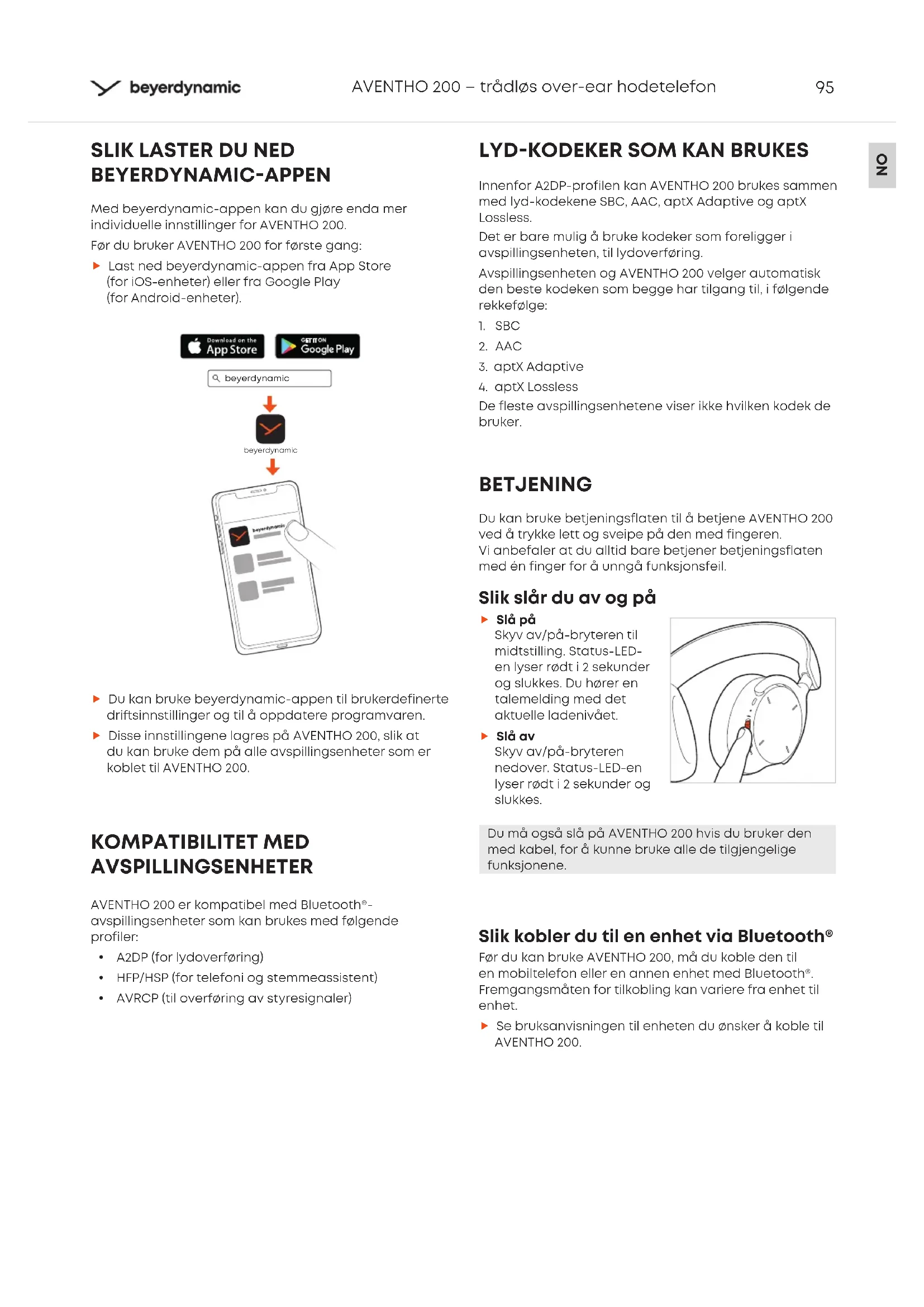 BEYERDYNAMIC-APPEN Med beyerdynamic-appen kan du gjøre enda mer individuelle innillinger for AVENTHO200. Før du bruker AVENTHO200 for føre gang: La ned beyerdynamic-appen fra App Store (for iOS-enheter) eller fra Google Play (for Android-enheter). Du kan bruke beyerdynamic-appen til brukerdefinee drisinnillinger og til å oppdatere programvaren. Disse innillingene lagres på AVENTHO200, slik at du kan bruke dem på alle avspillingsenheter som er koblet til AVENTHO200. KOMPATIBILITET MED AVSPILLINGSENHETER AVENTHO200 er kompatibel med Bluetooth®- avspillingsenheter som kan brukes med følgende profiler: y A2DP (for lydoveøring) y HFP/HSP (for telefoni og emmeassient) y AVRCP (til oveøring av yresignaler)