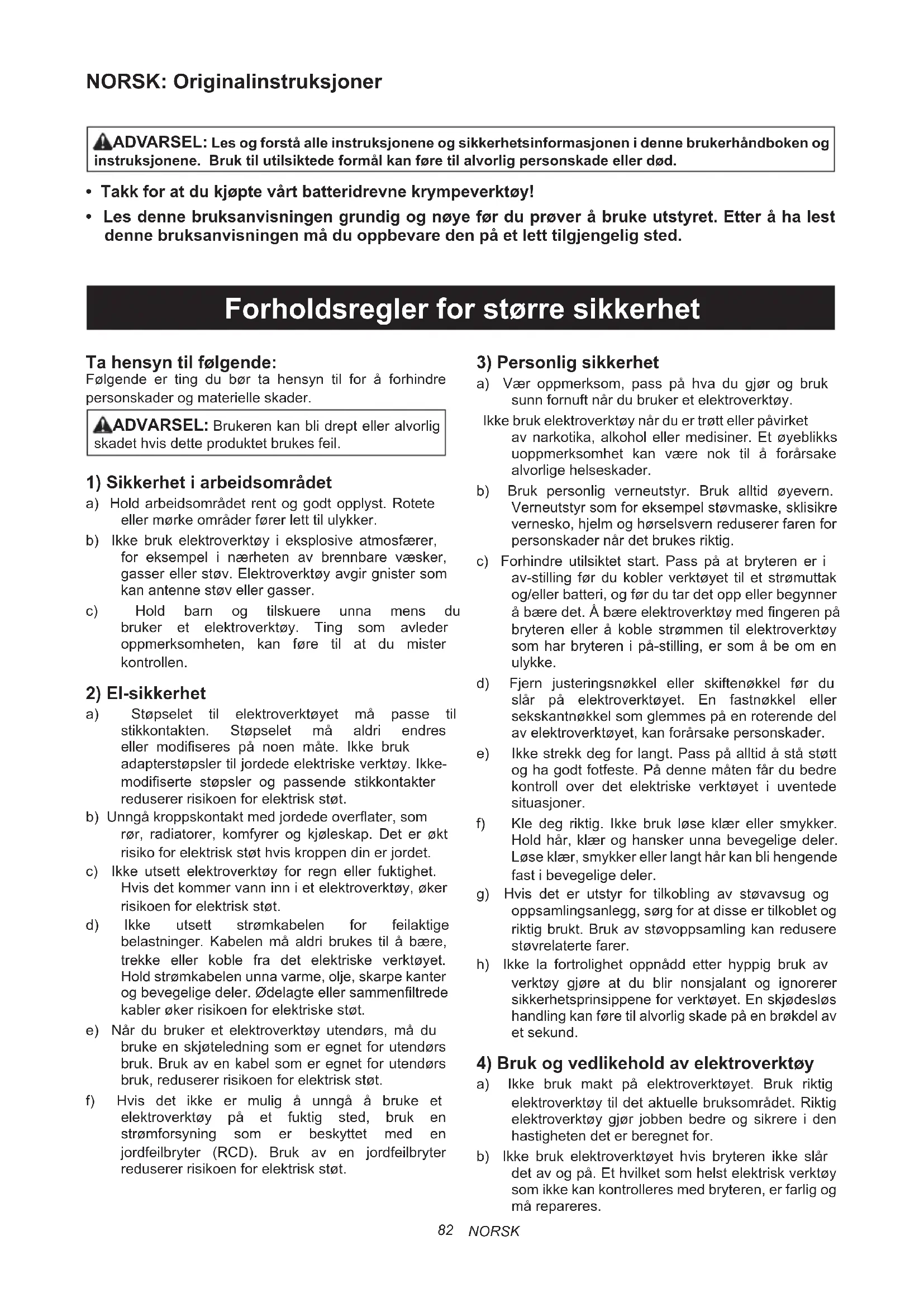 a) Få utført service på elektroverktøyet ditt av en kvalisert reparatør som kun bruker originale reservedeler. Dette sikrer at det fortsatt vil være trygt å bruke elektroverktøyet. b) Utfør aldri service på skadede batterier. Service på batterier skal kun utføres av produsenten eller autoriserte tjenesteleverandører. Hold elektroverktøyet i de isolerte gripeatene når du utfører en operasjon der festet kan komme i kontakt med skjulte ledninger. Festemidler som kommer i kontakt med en strømførende ledning, kan gjøre uisolerte metalldeler på elektroverktøyet strømførende og gi brukeren elektrisk støt.84 NORSK Forholdsregler ved bruk av det batteridrevne krympeverktøyet