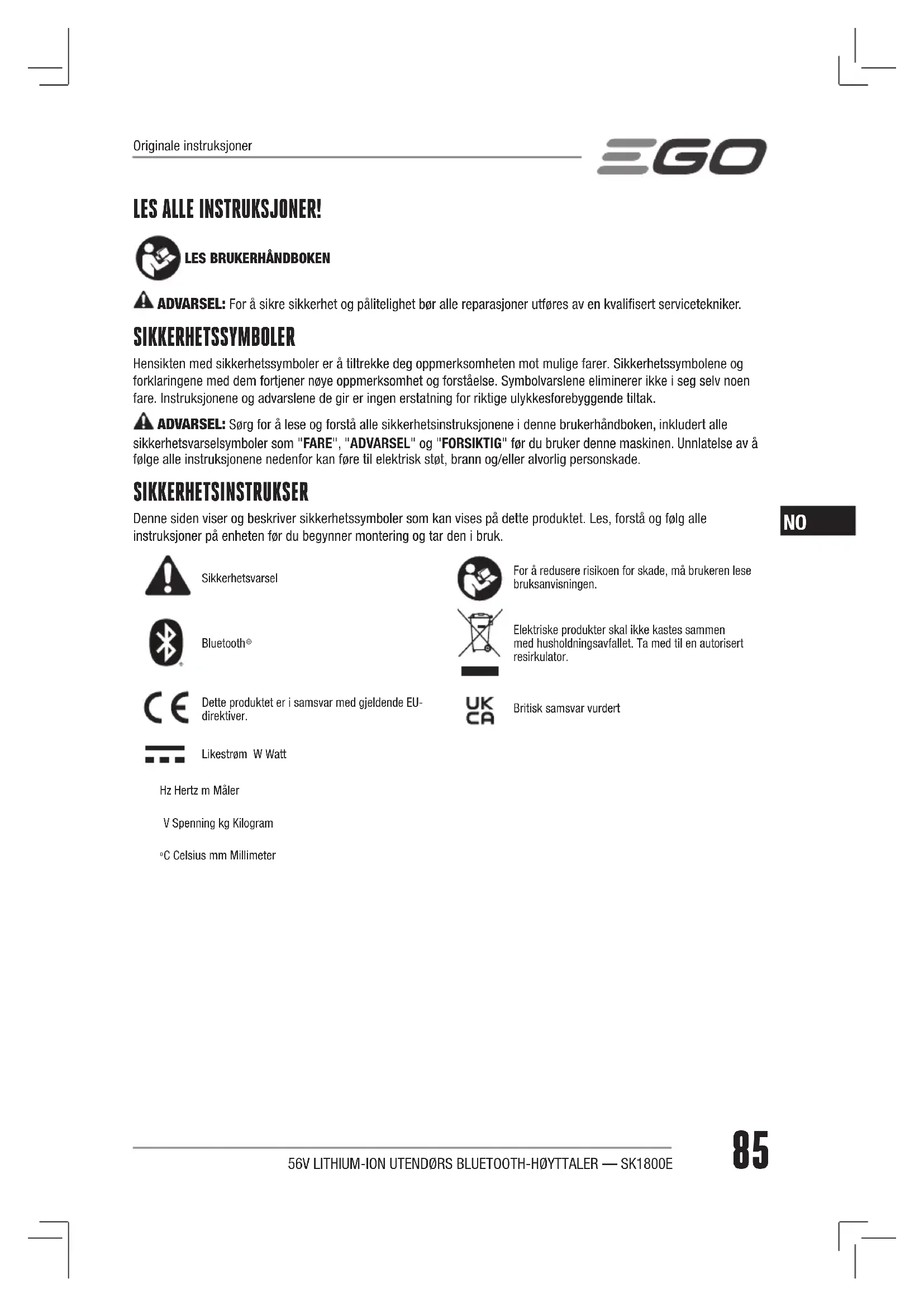 ADVARSEL: For å sikre sikkerhet og pålitelighet bør alle reparasjoner utføres av en kvalisert servicetekniker. SIKKERHETSSYMBOLER Hensikten med sikkerhetssymboler er å tiltrekke deg oppmerksomheten mot mulige farer. Sikkerhetssymbolene og forklaringene med dem fortjener nøye oppmerksomhet og forståelse. Symbolvarslene eliminerer ikke i seg selv noen fare. Instruksjonene og advarslene de gir er ingen erstatning for riktige ulykkesforebyggende tiltak. ADVARSEL: Sørg for å lese og forstå alle sikkerhetsinstruksjonene i denne brukerhåndboken, inkludert alle sikkerhetsvarselsymboler som "FARE", "ADVARSEL" og "FORSIKTIG" før du bruker denne maskinen. Unnlatelse av å følge alle instruksjonene nedenfor kan føre til elektrisk støt, brann og/eller alvorlig personskade. SIKKERHETSINSTRUKSER Denne siden viser og beskriver sikkerhetssymboler som kan vises på dette produktet. Les, forstå og følg alle instruksjoner på enheten før du begynner montering og tar den i bruk. SikkerhetsvarselFor å redusere risikoen for skade, må brukeren lese bruksanvisningen.Bluetooth Elektriske produkter skal ikke kastes sammen med husholdningsavfallet. Ta med til en autorisert resirkulator.Dette produktet er i samsvar med gjeldende EU-direktiver.Britisk samsvar vurdertLikestrøm W Watt Hz Hertz m MålerV Spenning kg Kilogram C Celsius mm Millimeter Originale instruksjoner86