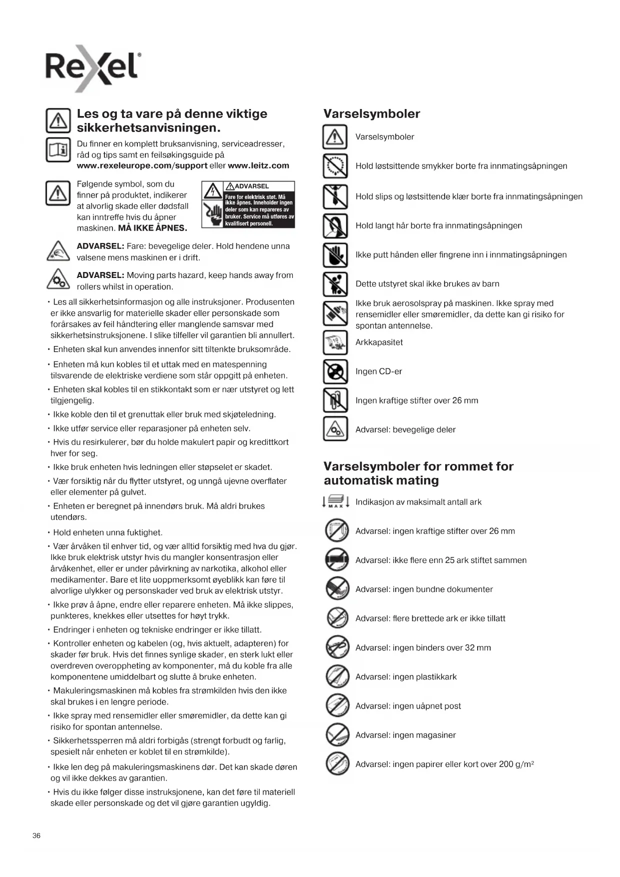 - Hvis du ikke følger disse instruksjonene, kan det føre til materiell skade eller personskade og det vil gjøre garantien ugyldig. Les og ta vare på denne viktige sikkerhetsanvisningen. Du finner en komplett bruksanvisning, serviceadresser, råd og tips samt en feilsøkingsguide på www.rexeleurope.com/support eller www.leitz.com Hold løstsittende smykker borte fra innmatingsåpningen Hold slips og løstsittende klær borte fra innmatingsåpningen Varselsymboler Hold langt hår borte fra innmatingsåpningen Ikke putt hånden eller fingrene inn i innmatingsåpningen Varselsymboler Arkkapasitet Ingen CD-er Ingen kraftige stifter over 26 mm Advarsel: bevegelige deler ADVARSEL: Fare: bevegelige deler. Hold hendene unna valsene mens maskinen er i drift. ADVARSEL: Moving parts hazard, keep hands away from rollers whilst in operation. Dette utstyret skal ikke brukes av barn Ikke bruk aerosolspray på maskinen. Ikke spray med rensemidler eller smøremidler, da dette kan gi risiko for spontan antennelse. Advarsel: ingen kraftige stifter over 26 mm Advarsel: ingen bundne dokumenter Advarsel: ikke flere enn 25 ark stiftet sammen Varselsymboler for rommet for automatisk mating Advarsel: flere brettede ark er ikke tillatt Advarsel: ingen binders over 32 mm Indikasjon av maksimalt antall ark Advarsel: ingen magasiner Advarsel: ingen papirer eller kort over 200 g/m² Advarsel: ingen plastikkark Advarsel: ingen uåpnet post373737 Ikon Type Modeller Knapp/indikator og handling Knapp for automatisk start og standby (trykk én gang) Manuell reversknapp (hold nede) Knapp for manuell fremoverkjøring (hold nede) Indikator for klar Indikator for overoppheting (la makuleringsmaskinen kjøle seg ned) Indikator for overbelastning/ papirstopp (reduser antall ark / fjern papiret som har stoppet) Indikator for full papirkurv (åpne døren og tøm papirkurven; 45X – løft av makuleringshodet og tøm papirkurven) Indikator for dør åpen eller makuleringshode fjernet (lukk døren godt eller sett hodet tilbake på kurven) Indikator for låst innleggingsdør (lås opp ved å angi en firesifret kode) Låse innleggingsdør – sikkerhetskodeknapp 1 Låse innleggingsdør – sikkerhetskodeknapp 2 Låse innleggingsdør – sikkerhetskodeknapp 3 Låse innleggingsdør – sikkerhetskodeknapp 4 Betjening