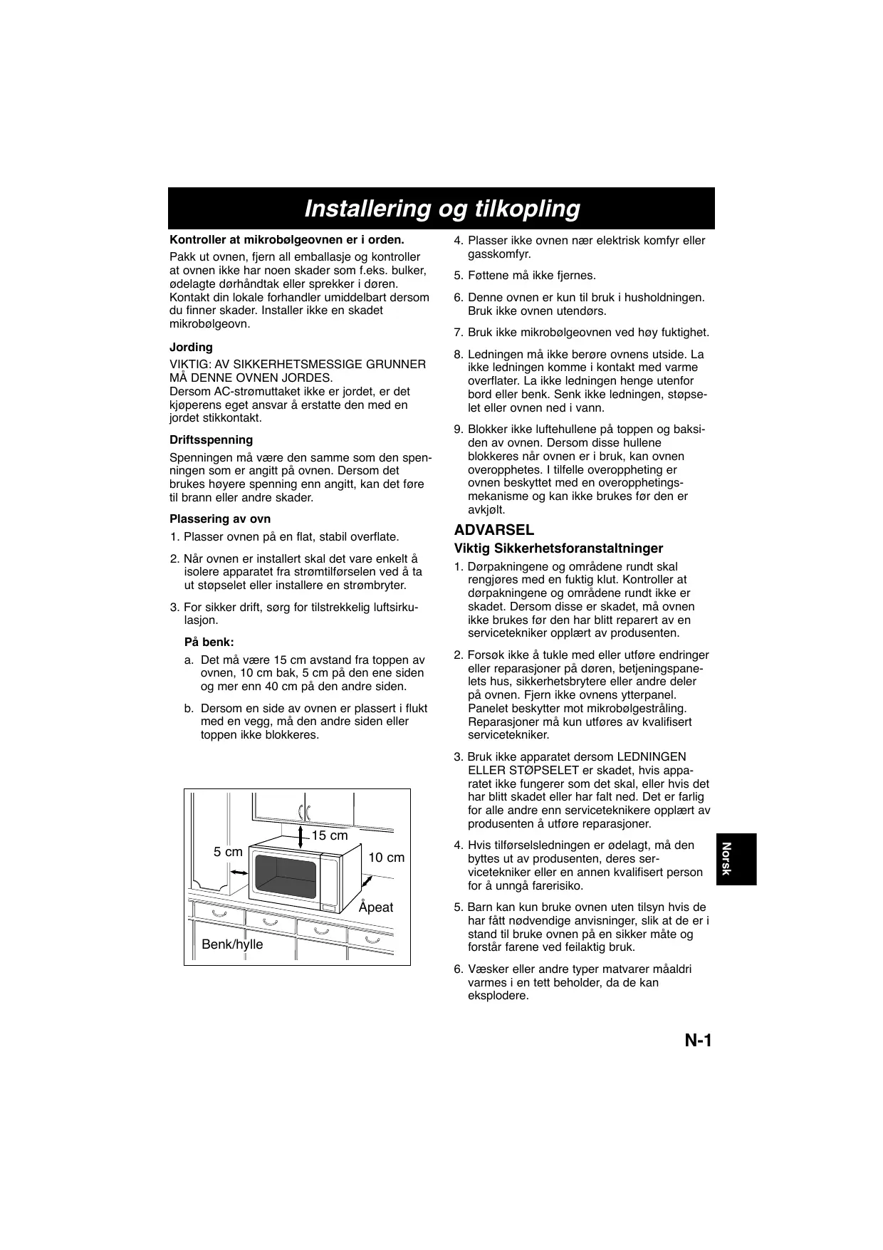 Utiliser une tension identique à celle spécifiée sur le four micro-ondes. Si on utilise une tension supérieure à celle indiquée, l’appareil risque de prendre feu ou d’être endommagé d’une autre manière. De même, si la tension est inférieure, votre appareil sera moins performant. Votre appareil doit être protégé par un fusible de 10 Ampères. Emplacement du four 1. Déposer le four sur une surface plate et stable. 2. Une fois le four installé, il faut pouvoir facilement couper son alimentation électrique, soit en retirant la prise murale soit en actionnant un disjoncteur ou un fusible. 3. Afin de garantir une utilisation optimale du four, veillez à ce qu’il soit suffisamment ventilé. Si vous placez l’appareil sur un plan de travail: a. Laissez un espace de 15 cm en haut du four, de 10 cm à l’arrière, de 5 cm d’un côté du four et d’au moins 40 cm de l’autre côté. b. Si vous placez le four contre le mur, veillez à ce que l’autre côté ou le dessus du four soit totalement libre.