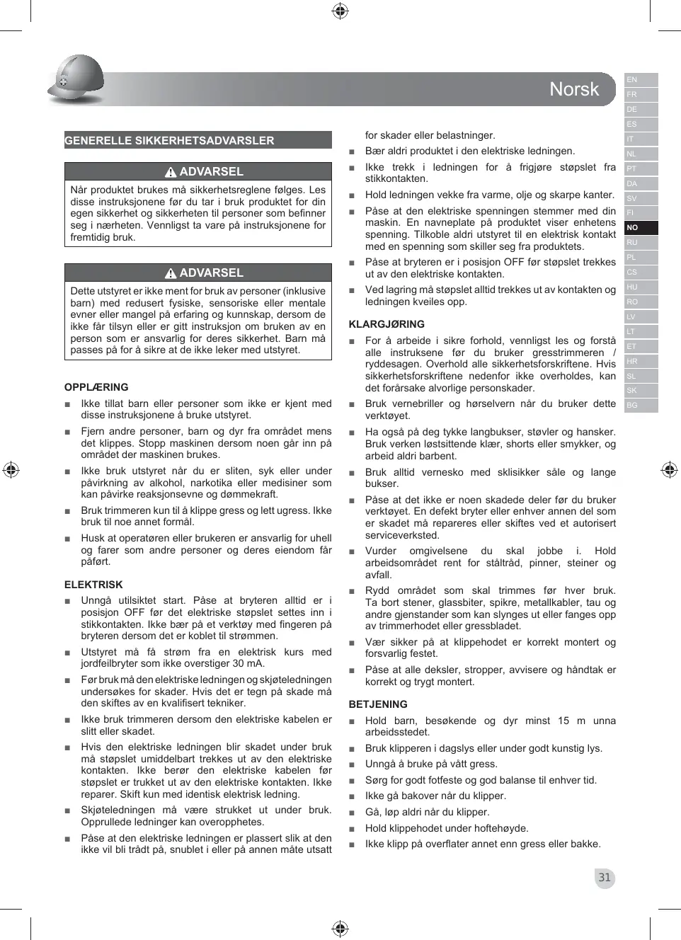 KLARGJØRING For å arbeide i sikre forhold, vennligst les og forstå alle instruksene før du bruker gresstrimmeren / ryddesagen. Overhold alle sikkerhetsforskriftene. Hvis sikkerhetsforskriftene nedenfor ikke overholdes, kan det forårsake alvorlige personskader. Ikke tillat barn eller personer som ikke er kjent med disse instruksjonene å bruke utstyret.