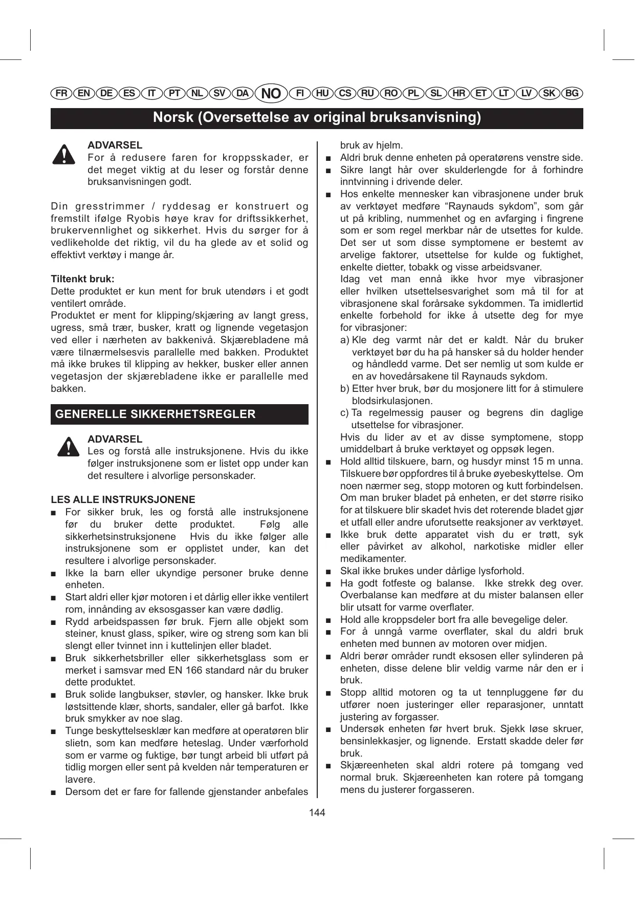 Din gresstrimmer / ryddesag er konstruert og fremstilt ifølge Ryobis høye krav for driftssikkerhet, brukervennlighet og sikkerhet. Hvis du sørger for å vedlikeholde det riktig, vil du ha glede av et solid og effektivt verktøy i mange år. Tiltenkt bruk: Dette produktet er kun ment for bruk utendørs i et godt ventilert område. Produktet er ment for klipping/skjæring av langt gress, ugress, små trær, busker, kratt og lignende vegetasjon ved eller i nærheten av bakkenivå. Skjærebladene må være tilnærmelsesvis parallelle med bakken. Produktet må ikke brukes til klipping av hekker, busker eller annen vegetasjon der skjærebladene ikke er parallelle med bakken. GENERELLE SIKKERHETSREGLER ADVARSEL Les og forstå alle instruksjonene. Hvis du ikke følger instruksjonene som er listet opp under kan det resultere i alvorlige personskader.