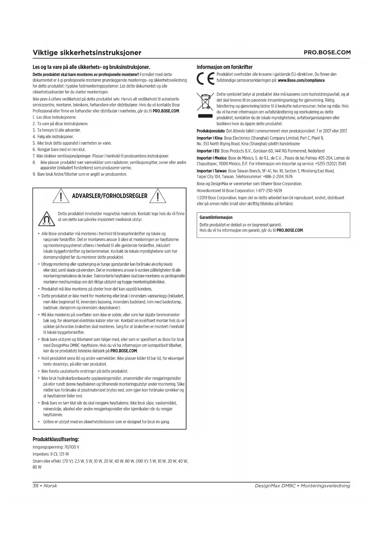 Produktklassifisering: Inngangsspenning: 70/100V Impedans: 8 Ω, 125W Strøm eller eekt: (70V): 2,5W, 5W, 10W, 20W, 40W, 80W, (100V): 5W, 10W, 20W, 40W, 80W Informasjon om forskrifter Produktet overholder alle kravene i gjeldende EU-direktiver. Du finner den fullstendige samsvarserklæringen på: www.Bose.com/compliance. Dette symbolet betyr at produktet ikke må kasseres som husholdningsavfall, ogat det skal leveres til en passende innsamlingsanlegg for gjenvinning. Riktig håndtering og gjenvinning bidrar til å beskytte naturressurser, helse og miljø. Hvis du vil ha mer informasjon om avfallshåndtering og resirkulering av dette produktet, kontakter du de lokale myndighetene, avfallsorganisasjonen eller butikken hvor du kjøpte dette produktet. Produksjonsdato: Det åttende tallet i serienummeret viser produksjonsåret: 7 er 2007 eller 2017. Importør i Kina: Bose Electronics (Shanghai) Company Limited, Part C, Plant 9, No. 353 North Riying Road, Kina (Shanghai) pilotfri handelssone Importør i EU: Bose Products B.V., Gorslaan 60, 1441 RG Purmerend, Nederland Importør i Mexico: Bose de México, S. de R.L. de C.V. , Paseo de las Palmas 405-204, Lomas de Chapultepec, 11000 México, D.F. For informasjon om importør og service: +5255 (5202) 3545 Importør i Taiwan: Bose Taiwan Branch, 9F-A1, No. 10, Section 3, Minsheng East Road, Taipei City 104, Taiwan. Telefonnummer: +886-2-2514 7676 Bose og DesignMax er varemerker som tilhører Bose Corporation. Hovedkontoret til Bose Corporation: 1-877-230-5639 ©2019 Bose Corporation. Ingen del av dette arbeidet kan bli reprodusert, endret, distribuert eller på annen måte brukt uten skriftlig tillatelse på forhånd. Garantiinformasjon Dette produktet er dekket av en begrenset garanti. Hvis du vil ha informasjon om garanti, går du til PRO.BOSE.COM. ADVARSLER/FORHOLDSREGLER Dette produktet inneholder magnetisk materiale. Kontakt lege hvis du vil finne ut om dette kan påvirke implantert medisinsk utstyr.