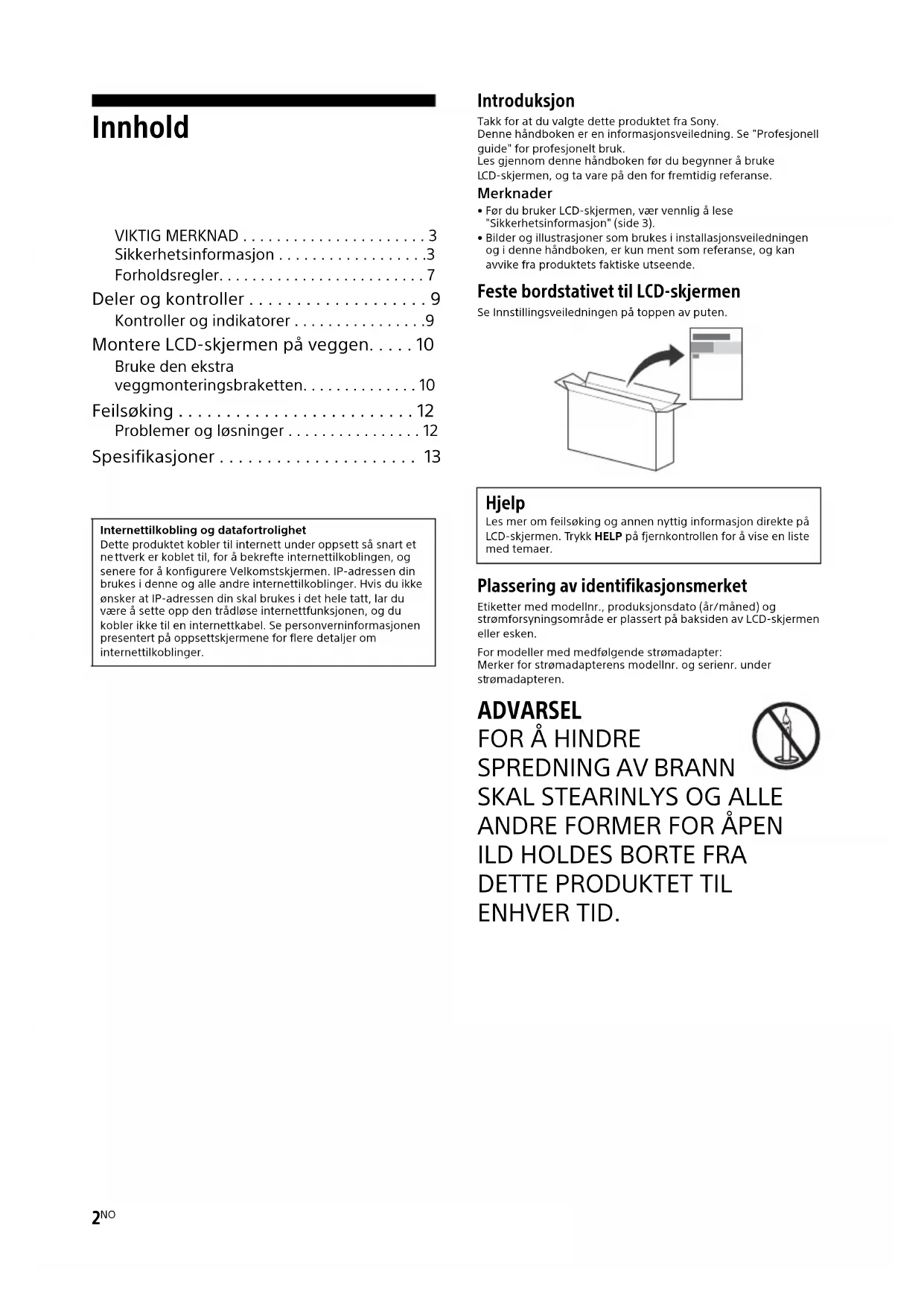 - Sørg for at skruene du har fjernet blir oppbevart på en trygg plass, utenfor barns rekkevidde.• Plasser LCD-skjermen med skjermen vendt ned mot et flatt og stabilt underlag som er dekket med et tykt og mykt stoff ved demontering av bordstativet fra LCD-skjermen for å hindre skader på overflaten i LCD-displayet. (kun FW-49/43BZ35F) Tilstrekkelig ekspertise er nødvendig for å installere dette produktet, spesielt for å fastslå at veggen kan bære LCD-skjermens vekt. Overlat monteringen av dette produktet til Sony-forhandlere eller autoriserte montører, og vær spesielt oppmerksom på sikkerheten under installasjon. Sony er ikke ansvarlig for eventuell skade eller personskade forårsaket av feil behandling eller installasjon.D:\SONY TV\SY18_CHHB_EU_RG141\4735226141\11NB\4735226141_11NB.fm master page: Right FW-85BZ35F / 75BZ35F / 65BZ35F / 55BZ35F / 49BZ35F / 43BZ35F 4-735-226-14(1)