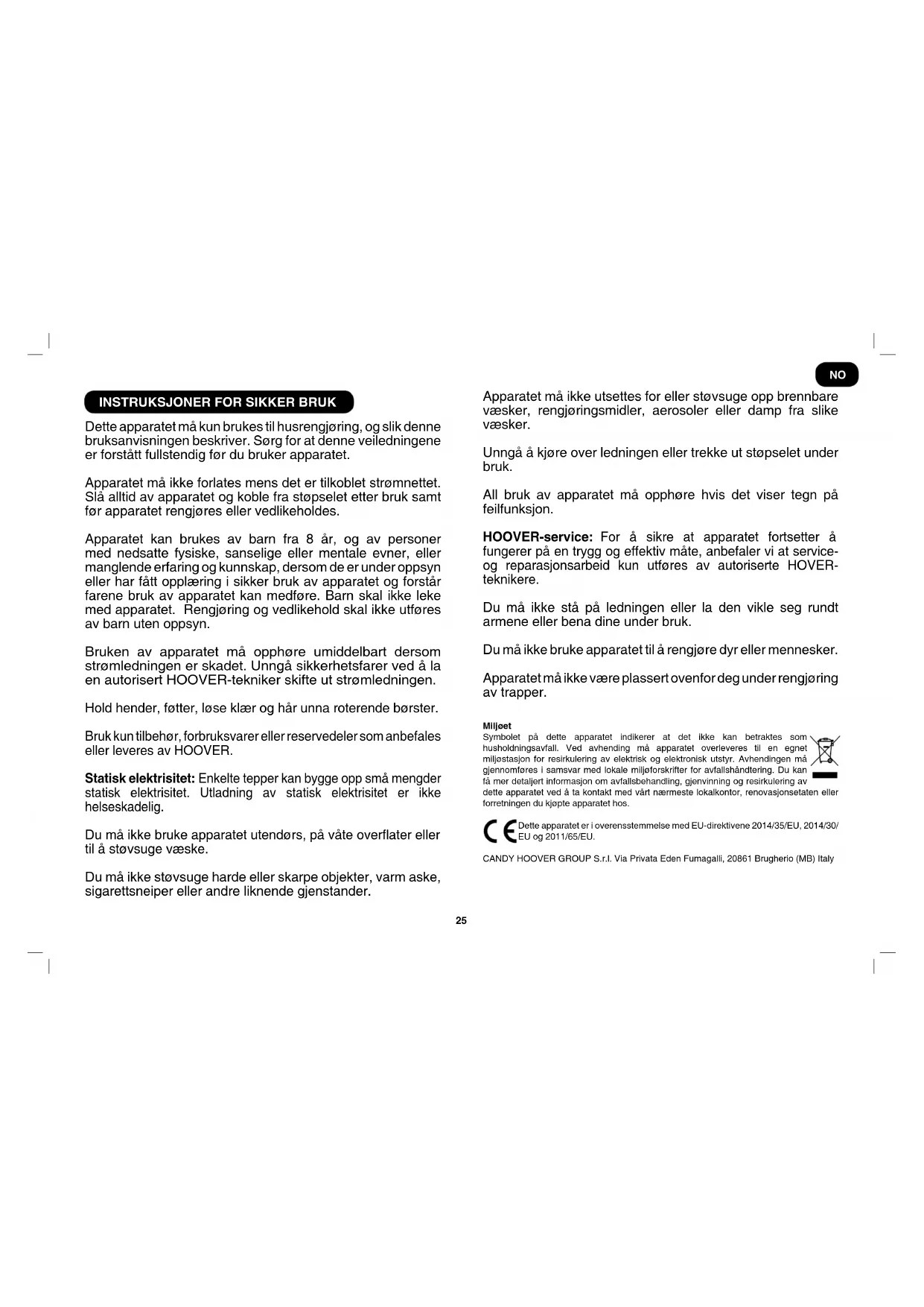 Dette apparatet må kun brukes til husrengjøring, og slik denne bruksanvisningen beskriver. Sørg for at denne veiledningene er forstått fullstendig før du bruker apparatet. Apparatet må ikke forlates mens det er tilkoblet strømnettet. Slå alltid av apparatet og koble fra støpselet etter bruk samt før apparatet rengjøres eller vedlikeholdes. Apparatet kan brukes av barn fra 8 år, og av personer med nedsatte fysiske, sanselige eller mentale evner, eller manglende erfaring og kunnskap, dersom de er under oppsyn eller har fått opplæring i sikker bruk av apparatet og forstår farene bruk av apparatet kan medføre. Barn skal ikke leke med apparatet. Rengjøring og vedlikehold skal ikke utføres av barn uten oppsyn. Bruken av apparatet må opphøre umiddelbart dersom strømledningen er skadet. Unngå sikkerhetsfarer ved å la en autorisert HOOVER-tekniker skifte ut strømledningen. Hold hender, føtter, løse klær og hår unna roterende børster. Bruk kun tilbehør, forbruksvarer eller reservedeler som anbefales eller leveres av HOOVER. Statisk elektrisitet: Enkelte tepper kan bygge opp små mengder statisk elektrisitet. Utladning av statisk elektrisitet er ikke helseskadelig. Du må ikke bruke apparatet utendørs, på våte overater eller til å støvsuge væske. Du må ikke støvsuge harde eller skarpe objekter, varm aske, sigarettsneiper eller andre liknende gjenstander. Apparatet må ikke utsettes for eller støvsuge opp brennbare væsker, rengjøringsmidler, aerosoler eller damp fra slike væsker. Unngå å kjøre over ledningen eller trekke ut støpselet under bruk. All bruk av apparatet må opphøre hvis det viser tegn på feilfunksjon. HOOVER-service: For å sikre at apparatet fortsetter å fungerer på en trygg og effektiv måte, anbefaler vi at service- og reparasjonsarbeid kun utføres av autoriserte HOVER- teknikere. Du må ikke stå på ledningen eller la den vikle seg rundt armene eller bena dine under bruk. Du må ikke bruke apparatet til å rengjøre dyr eller mennesker. Apparatet må ikke være plassert ovenfor deg under rengjøring av trapper. Miljøet Symbolet på dette apparatet indikerer at det ikke kan betraktes som husholdningsavfall. Ved avhending må apparatet overleveres til en egnet miljøstasjon for resirkulering av elektrisk og elektronisk utstyr. Avhendingen må gjennomføres i samsvar med lokale miljøforskrifter for avfallshåndtering. Du kan få mer detaljert informasjon om avfallsbehandling, gjenvinning og resirkulering av dette apparatet ved å ta kontakt med vårt nærmeste lokalkontor, renovasjonsetaten eller forretningen du kjøpte apparatet hos. Dette apparatet er i overensstemmelse med EU-direktivene 2014/35/EU, 2014/30/ EU og 2011/65/EU. CANDY HOOVER GROUP S.r.l. Via Privata Eden Fumagalli, 20861 Brugherio (MB) Italy