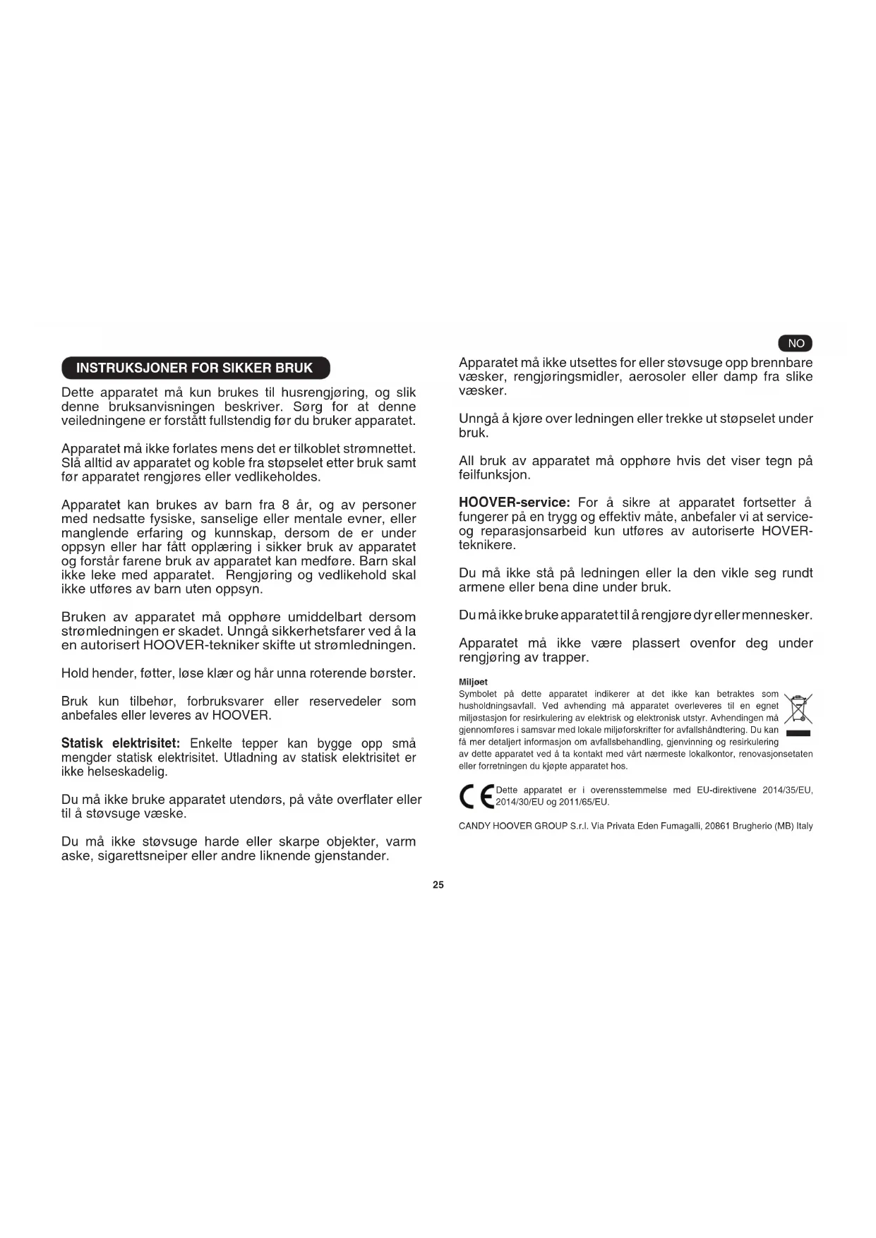 Dette apparatet må kun brukes til husrengjøring, og slik denne bruksanvisningen beskriver. Sørg for at denne veiledningene er forstått fullstendig før du bruker apparatet. Apparatet må ikke forlates mens det er tilkoblet strømnettet. Slå alltid av apparatet og koble fra støpselet etter bruk samt før apparatet rengjøres eller vedlikeholdes. Apparatet kan brukes av barn fra 8 år, og av personer med nedsatte fysiske, sanselige eller mentale evner, eller manglende erfaring og kunnskap, dersom de er under oppsyn eller har fått opplæring i sikker bruk av apparatet og forstår farene bruk av apparatet kan medføre. Barn skal ikke leke med apparatet. Rengjøring og vedlikehold skal ikke utføres av barn uten oppsyn. Bruken av apparatet må opphøre umiddelbart dersom strømledningen er skadet. Unngå sikkerhetsfarer ved å la en autorisert HOOVER-tekniker skifte ut strømledningen. Hold hender, føtter, løse klær og hår unna roterende børster. Bruk kun tilbehør, forbruksvarer eller reservedeler som anbefales eller leveres av HOOVER. Statisk elektrisitet: Enkelte tepper kan bygge opp små mengder statisk elektrisitet. Utladning av statisk elektrisitet er ikke helseskadelig. Du må ikke bruke apparatet utendørs, på våte overater eller til å støvsuge væske. Du må ikke støvsuge harde eller skarpe objekter, varm aske, sigarettsneiper eller andre liknende gjenstander. Apparatet må ikke utsettes for eller støvsuge opp brennbare væsker, rengjøringsmidler, aerosoler eller damp fra slike væsker. Unngå å kjøre over ledningen eller trekke ut støpselet under bruk. All bruk av apparatet må opphøre hvis det viser tegn på feilfunksjon. HOOVER-service: For å sikre at apparatet fortsetter å fungerer på en trygg og effektiv måte, anbefaler vi at service- og reparasjonsarbeid kun utføres av autoriserte HOVER- teknikere. Du må ikke stå på ledningen eller la den vikle seg rundt armene eller bena dine under bruk. Du må ikke bruke apparatet til å rengjøre dyr eller mennesker. Apparatet må ikke være plassert ovenfor deg under rengjøring av trapper. Miljøet Symbolet på dette apparatet indikerer at det ikke kan betraktes som husholdningsavfall. Ved avhending må apparatet overleveres til en egnet miljøstasjon for resirkulering av elektrisk og elektronisk utstyr. Avhendingen må gjennomføres i samsvar med lokale miljøforskrifter for avfallshåndtering. Du kan få mer detaljert informasjon om avfallsbehandling, gjenvinning og resirkulering av dette apparatet ved å ta kontakt med vårt nærmeste lokalkontor, renovasjonsetaten eller forretningen du kjøpte apparatet hos. Dette apparatet er i overensstemmelse med EU-direktivene 2014/35/EU, 2014/30/EU og 2011/65/EU. CANDY HOOVER GROUP S.r.l. Via Privata Eden Fumagalli, 20861 Brugherio (MB) Italy NO*Bare enkelte modeller ** Kun for enkelte mdeller. Munnstykkene kan variere fra modell til modell