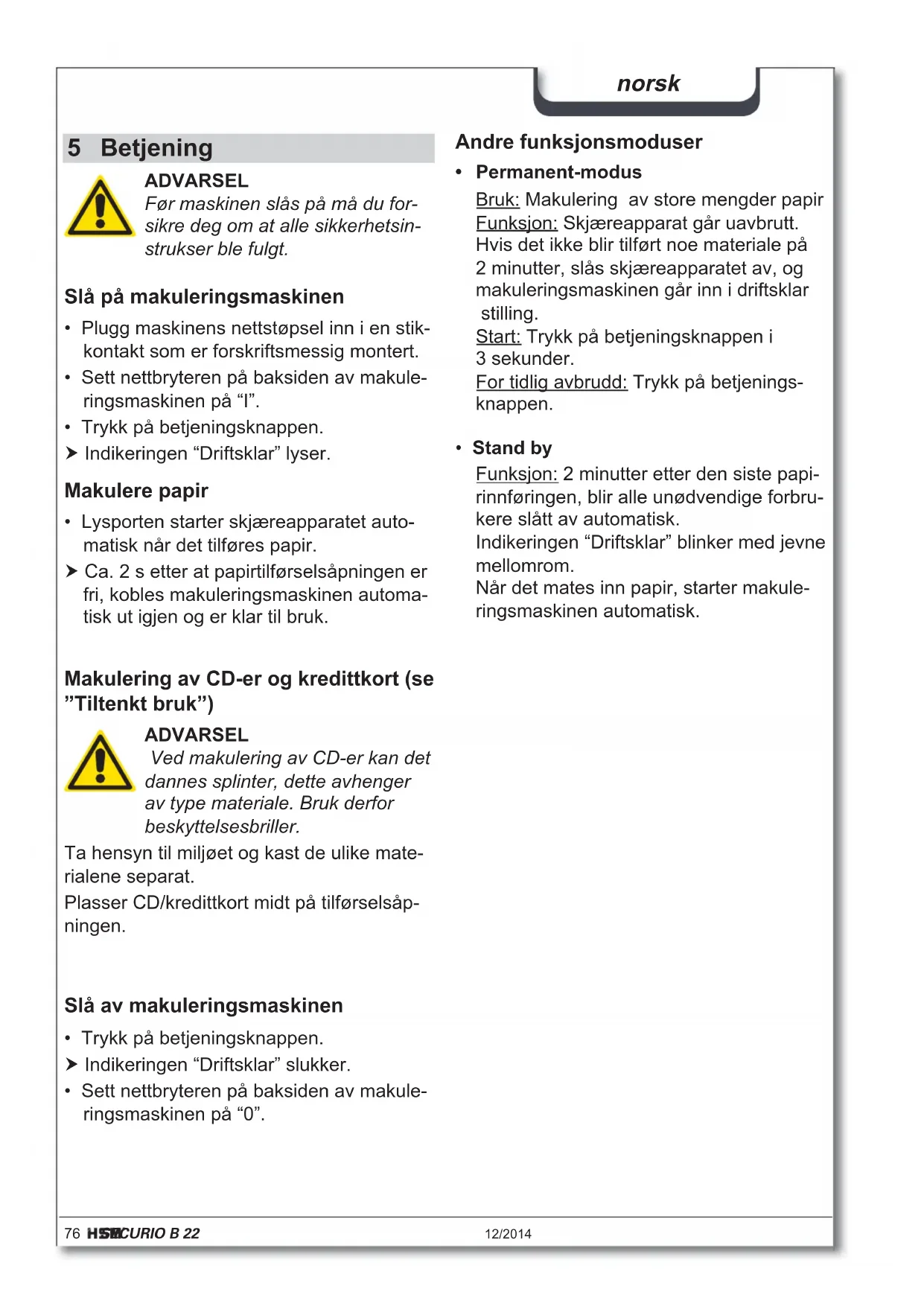 - RoHS-direk ivi 2011/65/EU EU-vaa mustenmukaisuusvakuutuksen voi pyytää valmistajalta.12/2014 SECURIO B 22 73 norsk 2 Sikkerhetsinstrukser Klassifi sering Sikkerhetsinstruks Forklaring ADVARSEL Hvis advarselen ikke overholdes, kan det føre til livstruende skader. Merk Hvis instruksen ikke overholdes, kan det føre til materielle skader. Les bruksanvisningen før du tar i bruk maskinen, oppbevar den for senere bruk og gi den videre til senere brukere. Ta hensyn til sikkerhetsinstruksene som er plassert på makuleringsmaskinen! ADVARSEL Farlig for barn og andre men- nesker! Maskinen må ikke brukes av per- soner (inklusive barn under 14 år) med svekkede fysiske, sensoriske eller psykiske ferdigheter eller manglende erfaring og/eller man- gelfull kunnskap, med mindre de er under oppsikt av kompetente personer eller at de får veiledning om hvordan apparatet skal brukes. Barn må holdes under oppsikt for å være sikker på at de ikke leker med appara- tet. Ikke forlat makuleringsmaskinen påslått uten tilsyn. 1 Tiltenkt bruk, garanti Se merkeskiltet på apparatets bakside for hvilken kuttebredde og nettspenning maku- leringsmaskinen er beregnet for, og les de aktuelle punktene i bruksanvisningen. Makuleringsmaskinen er utelukkende be- regnet på makulering av papir. Avhengig av skjæremåte kan også små mengder av følgende materialer makuleres: Skjærebredde (mm) 5,8 3,9 3,9x30 1,9x15 Kredittkort ●● ● ● CD-er ● Det robuste skjæreapparatet er ufølsomt overfor stifter og binderser. Tips: Makuleringsmaskiner med partikkel- skjæreapparat tilbys også alternativt med et apparat for automatisk smøring av skjæ- reapparatet. Se den vedlagte dokumenta- sjonen til smøreenheten hvis din maskin er utstyrt med en slik. Garantitiden for makuleringsmaskinen er på 3 år. Det gis en egen garanti som er uav- hengig av garantiytelsen for HSM helstål skjæreaksler i makuleringsmaskinen i løpet av hele apparatets levetid (HSM Lifetime Warranty). Slitasje, skader på grunn av utilsiktet bruk samt inngrep fra tredje part omfattes ikke av garantien. HMS garanterer levering av reservedeler i 10 år etter at produksjonen av denne mo- dellen opphører.74 SECURIO B 22 12/2014 norsk ADVARSEL Farlig nettspenning! Feil håndtering av maskinen kan føre til elektrisk støt. – Kontroller at spenning og frekvens på ditt strømnett stemmer overens med spesifi - kasjonene på merkeskiltet før du setter i nettstøpselet. – Forsikre deg om at nettstøpselet er lett tilgjengelig. – Pass på at det ikke kommer vann i maku- leringsmaskinen. Verken nettkabel eller nettstøpsel må dyppes i vann. – Ta aldri i nettstøpslet med våte hender. – Trekk aldri nettstøpslet ut av stikkontak- ten etter ledningen, ta alltid tak i selve nettstøpslet. – Bruk apparatet kun innendørs og på et tørt sted. Det må aldri brukes i våtrom el- ler i regnvær. Kontroller regelmessig om appa- ratet og kabelen er skadet. Slå av makuleringsmaskinen og trekk ut kontakten ved skader eller feil- funksjon samt før fl ytting eller rengjøring. – Hold apparatet, nettstøpslet og nettkabe- len unna åpen fl amme og varme fl ater. Ventilasjonsåpningene må være fri og befi nne seg min. 5 cm. fra vegg eller mø- bler. Servicearbeider som innebærer at man må fjerne kapslingsdekslene, må kun utføres av HMS-kunde- service og service-teknikere fra våre avtalepartnere. Adresser til kundeservice se side 160. Merk Fare på grunn av feil bruk Bruk maskinen kun slik det er beskrevet i kapitlet ”Tiltenkt bruk”. ADVARSEL Fare for personskader! Grip aldri inn i sprekken på papi- rinnmatingsåpningen. Fare for personskader på grunn av oppfanging! Ikke beveg langt hår, løst antrekk, slips, sjal, hals- og armbånd etc. inn i området rundt papirinnma- tingsåpningen. Ikke makuler noe materiale som har lett for å danne løkker, som f.eks. bånd, snorer, plastfolie. Fare for personskader på grunn av splin- ter! Ved makulering av harde kredittkort eller CD-er må man bruke beskyttelsesbriller.12/2014 SECURIO B 22 75 norsk 3 Oversikt Betjenings- og indikeringsele- menter ReverseringsknappIndikering:Beholder fullSkjæreapparat blokkertBeholder åpenDriftsklarBetjeningsknapp 4 Leveringsomfang Tilbehør