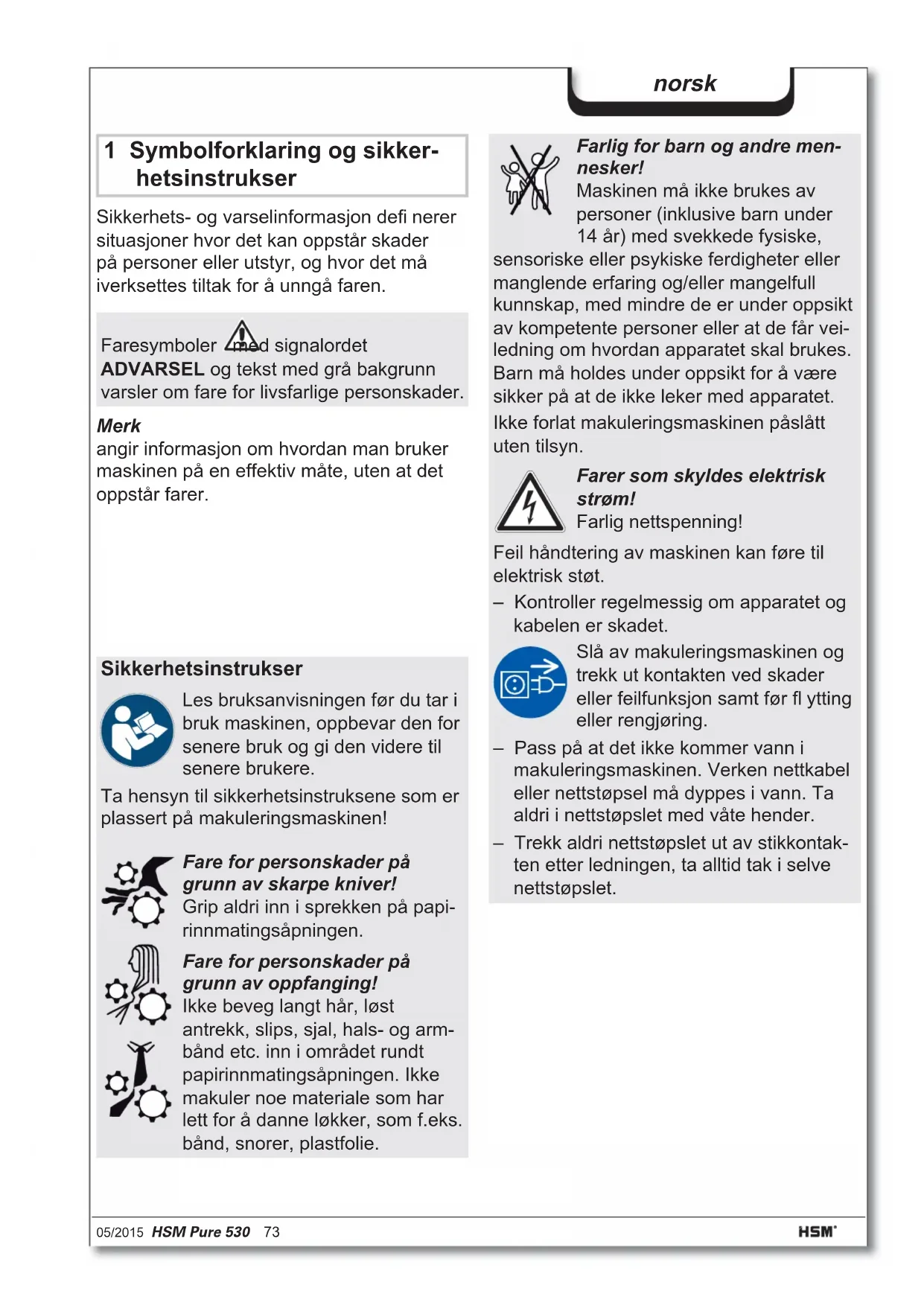 Betjenings- og indikeringselementer Indikering Beholder full Indikering Driftsklar Indikering Skjæreapparat blokkert Dør åpen / Sikkerhetselement trykket Betjeningsknapp Reverseringsknapp Garantitiden for makuleringsmaskinen er på 2 år. Det gis en egen garanti som er uav- hengig av garantiytelsen for HSM helstål skjæreaksler i makuleringsmaskinen i løpet av hele apparatets levetid (HSM Lifetime Warranty). Slitasje, skader på grunn av utilsiktet bruk samt inngrep fra tredje part omfattes ikke av garantien. HMS garanterer levering av reservede- ler i 10 år etter at produksjonen av denne modellen opphører. Makuleringsmaskinen er utelukkende beregnet på makulering av papir. Avhengig av skjæremåte kan også små mengder av følgende materialer makuleres: Det robuste skjæreapparatet er ufølsomt overfor stifter og binderser. Skjærebredde (mm) 5,8 3,9 4,5x30 1,9x15 Kredittkort ●● ● ● CD-er ●● ●05/2015 HSM Pure 530 75 norsk 4 Igangsetting ADVARSEL Farlig nettspenning! Feil håndtering av mas- kinen kan føre til elektrisk støt. – Bruk apparatet kun innendørs og på et tørt sted. Det må aldri brukes i våtrom eller i regnvær. – Hold apparatet, nettstøpslet og nett- kabelen unna åpen fl amme og varme fl ater. Ventilasjonsåpningene må være fri og befi nne seg min. 5 cm. fra vegg eller møbler. – Forsikre deg om at nettstøpselet er lett tilgjengelig. – Kontroller at spenning og frekvens på ditt strømnett stemmer overens med spesifi kasjonene på merkeskiltet før du setter i nettstøpselet.